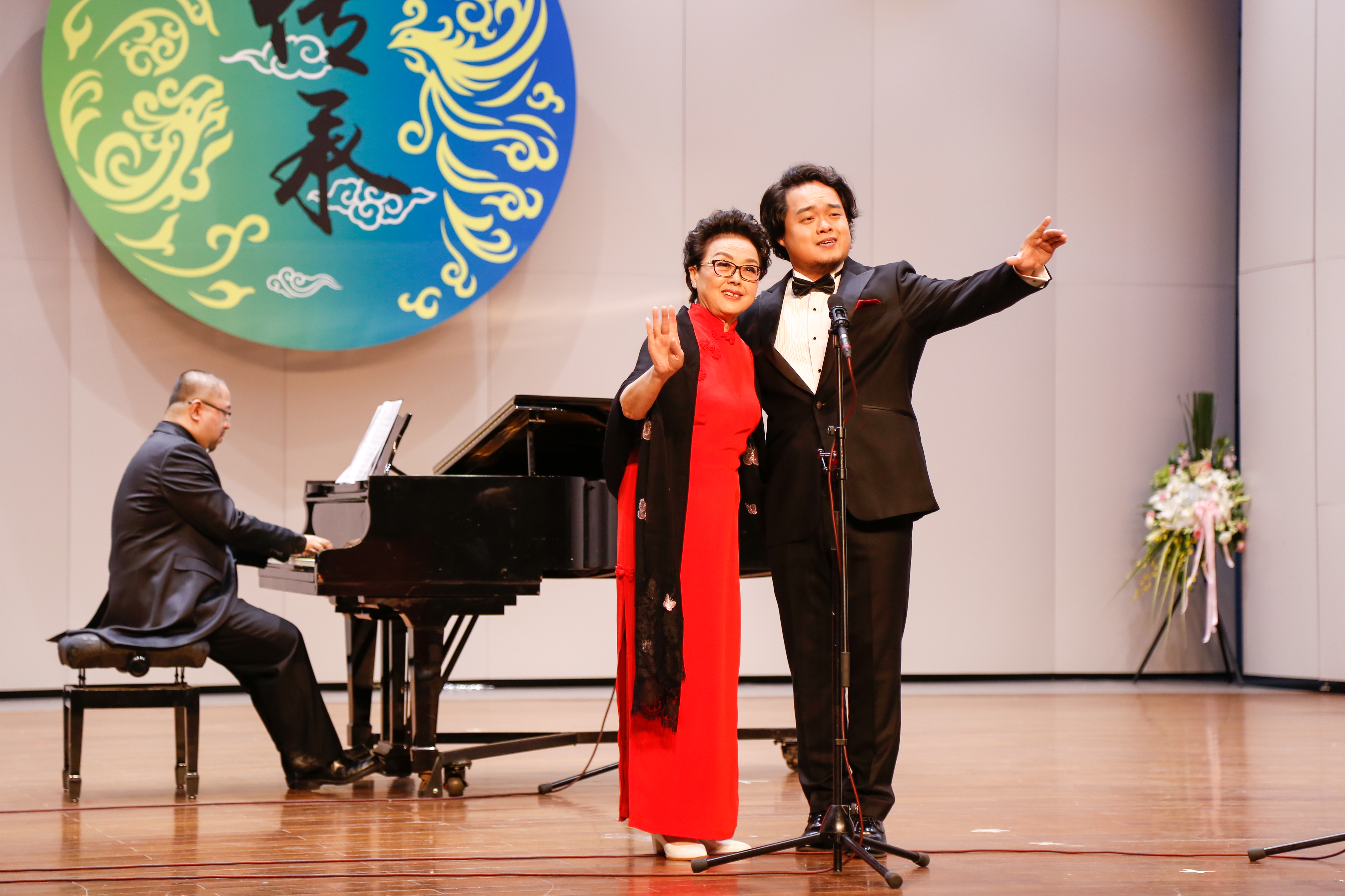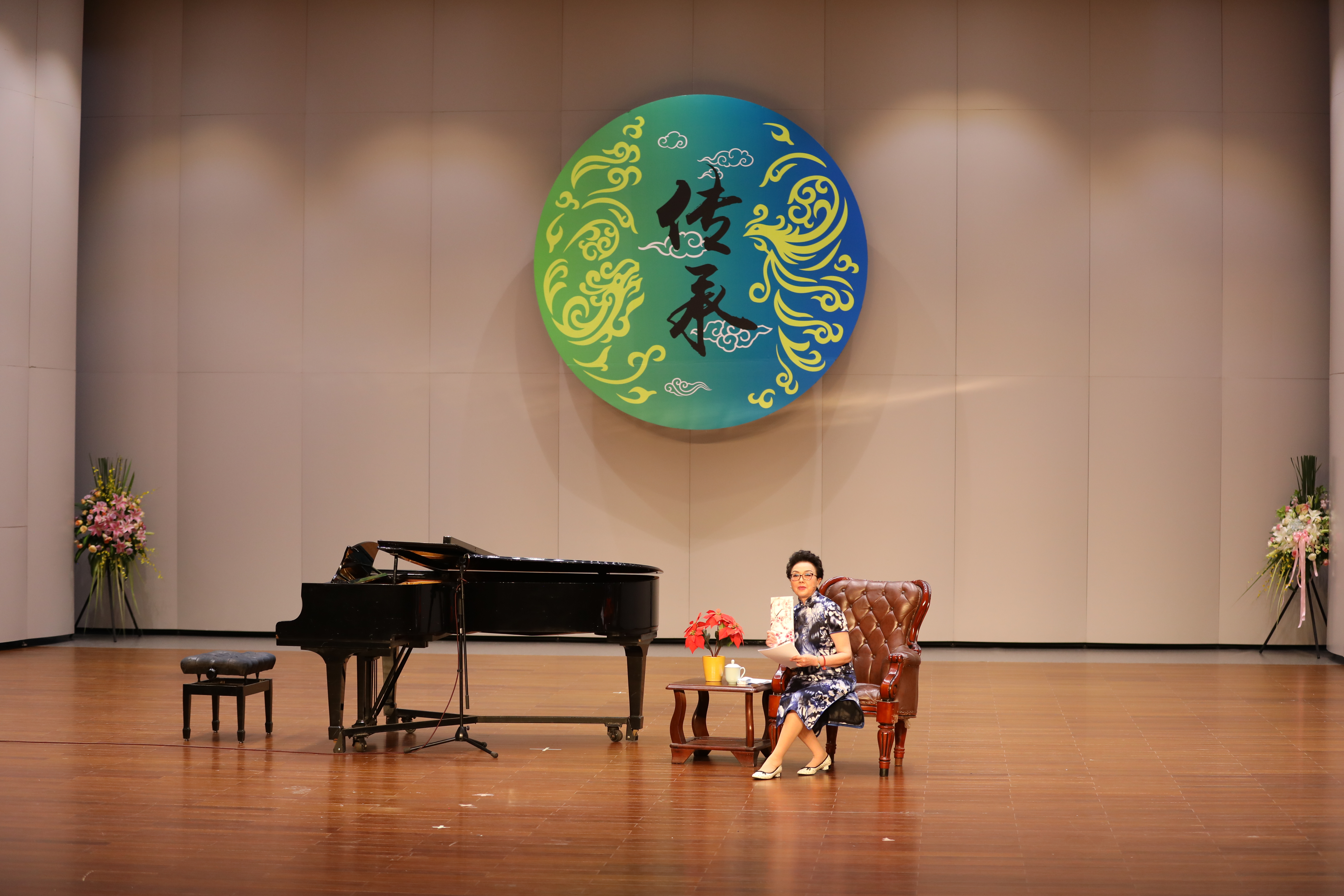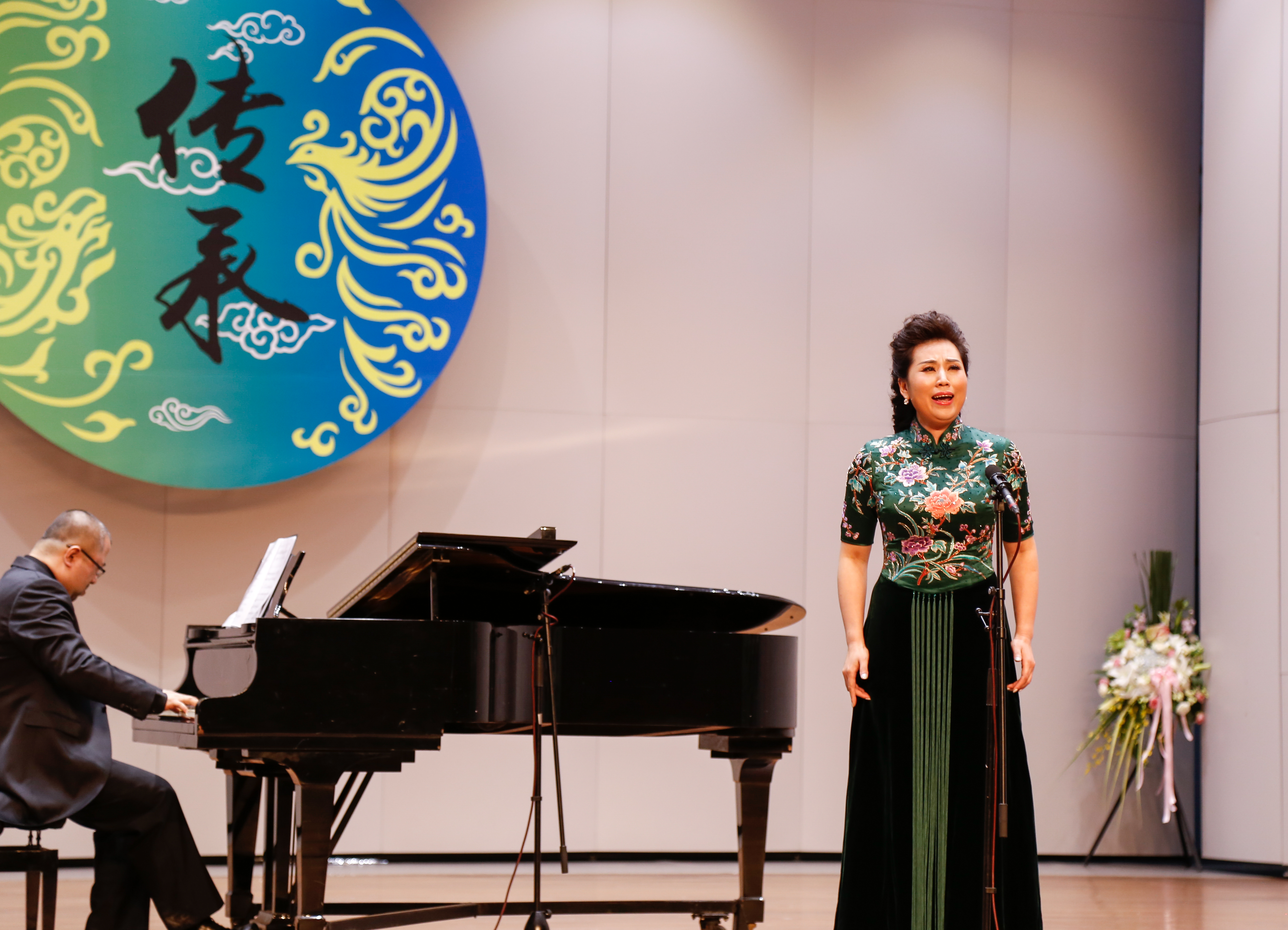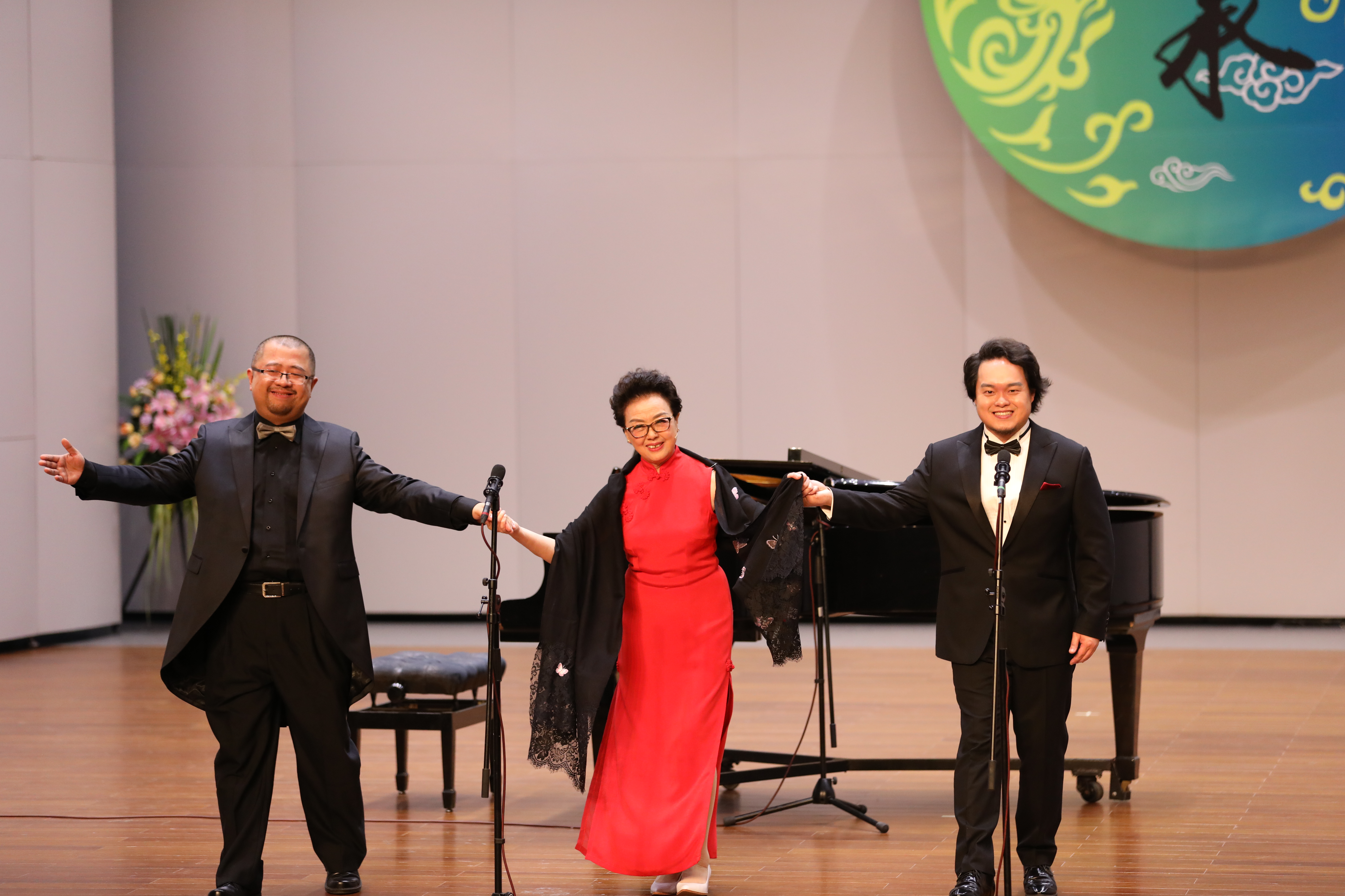 当晚浙江音乐厅大堂变成了花的海洋,花篮摆成了一条“花毯”,满眼望去都是祝胡素银音乐大讲堂暨师生音乐会圆满成功。胡素银为国家一级演员,第八届、九届浙江省政协委员,中国音乐家协会会员,浙江省音乐家协会声乐专业委员会顾问。曾是民盟浙江省委会委员,2005年11月荣获文化部“第七届区永熙优秀音乐教育奖”。对民族音乐文化和音乐表演艺术的执着,是70多岁的胡素银一直坚守与传承的。音乐会伊始,她提到中共中央办公厅、国务院办公厅印发的《关于实施中华优秀传统文化传承发展工程的意见》,就像一面旗帜,让她有底气在大讲堂上和大家交流中华民族优秀传统文化传承。传承发展工程最重要的是“人”,是教育,立德树人是根本任务。这就是讲座名称的由来。胡素银从1987年调入浙江艺术学校(现为浙江艺术职业学院)越剧科担任声乐老师讲起,讲述了一路走来,面对不同学生不同嗓音条件的开发,音乐教育理念在一代代学生身上的呈现,向观众传递民歌知识,讲述民歌故事。她说,自己一直以来坚信,做难事必有所得。民歌,需要有人记住,有人欣赏,有人传承。在这个时代,机会来了。