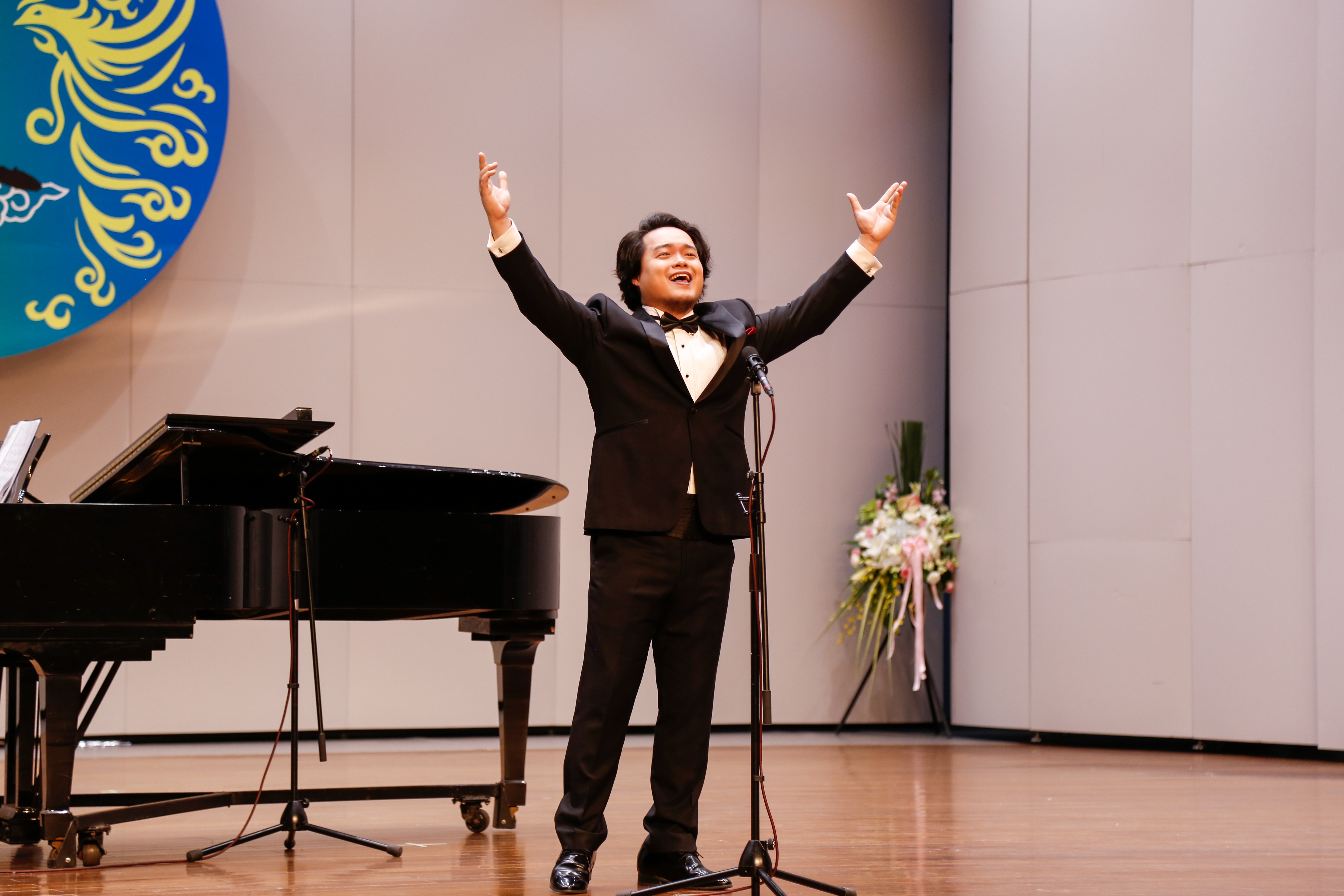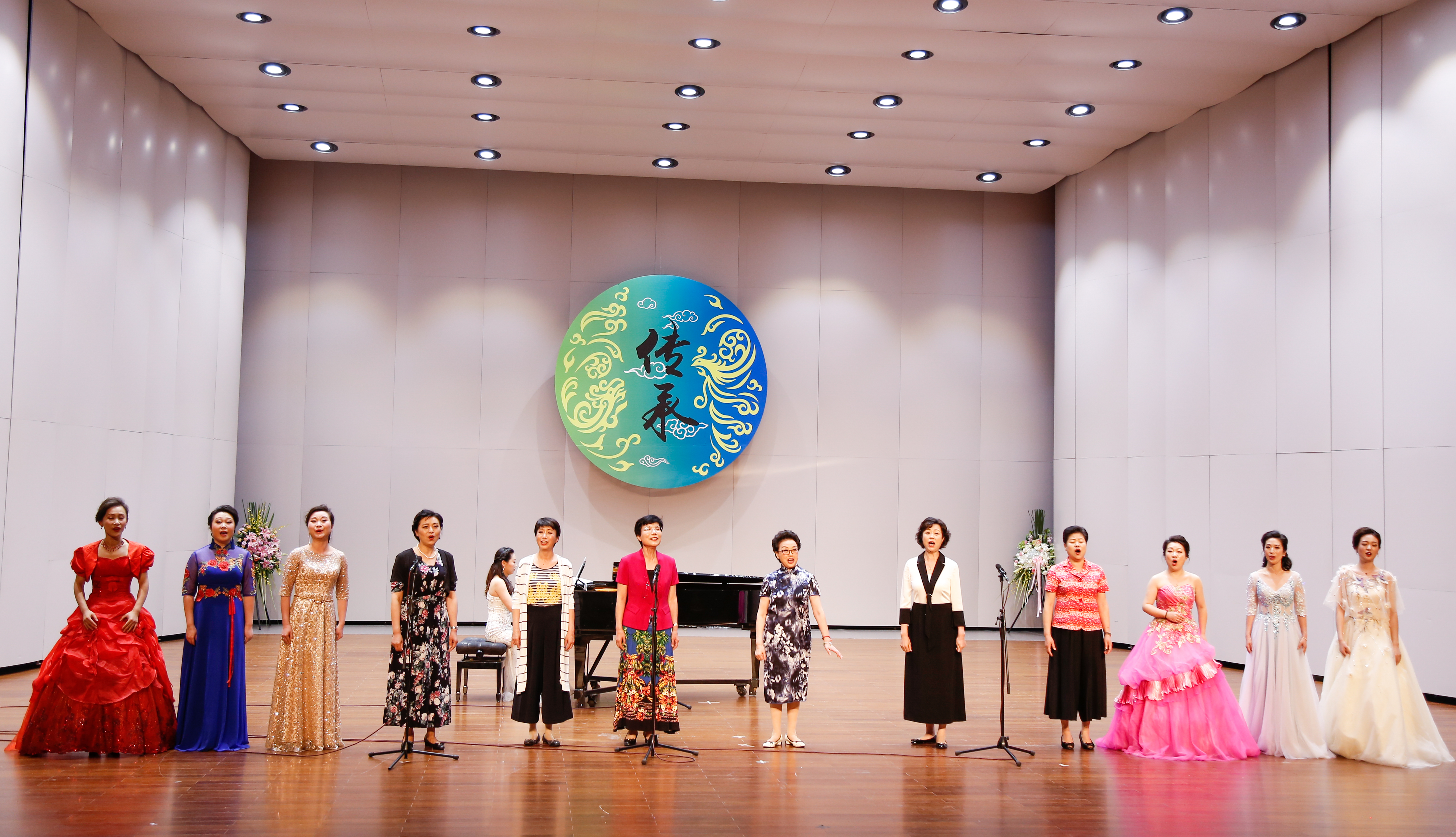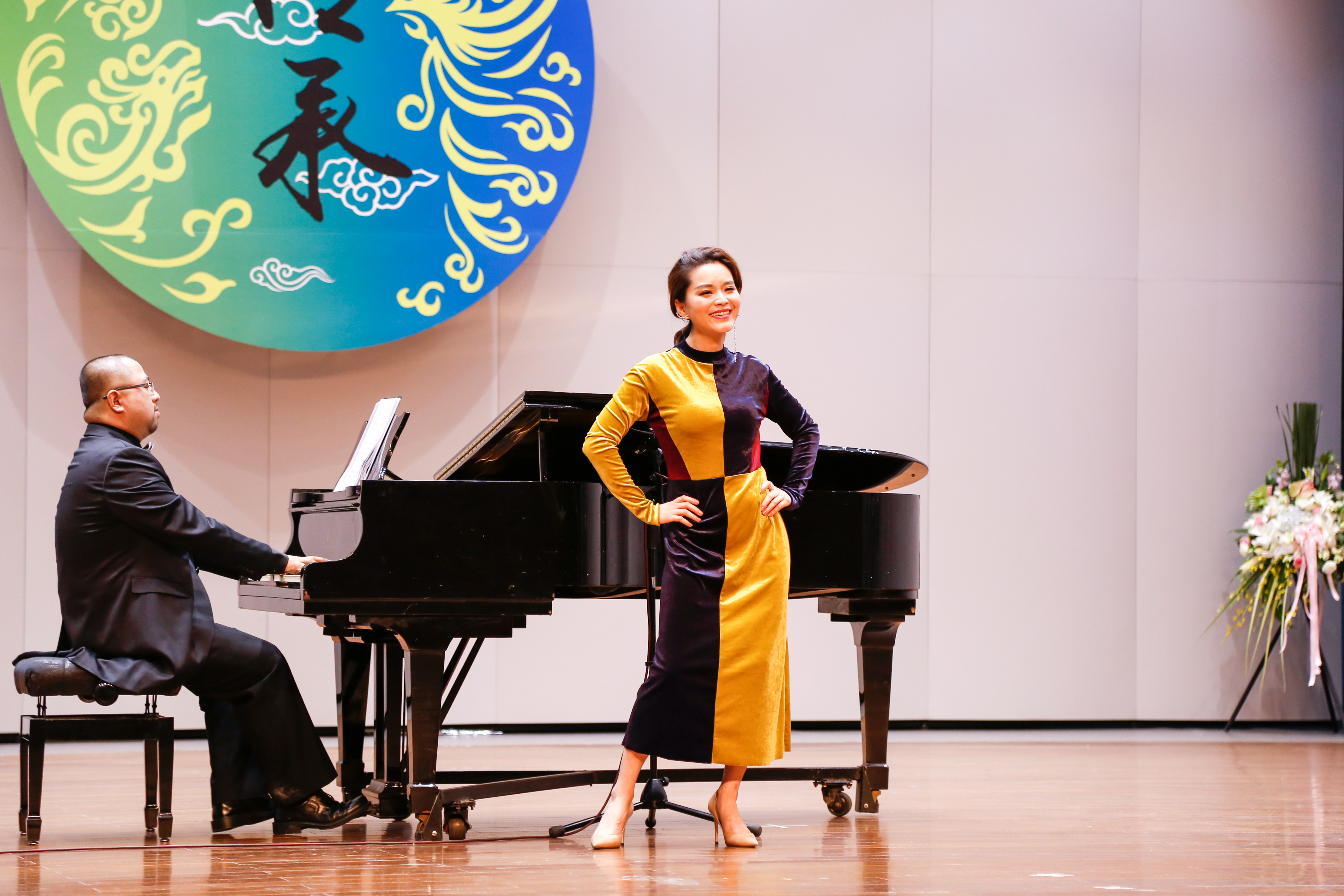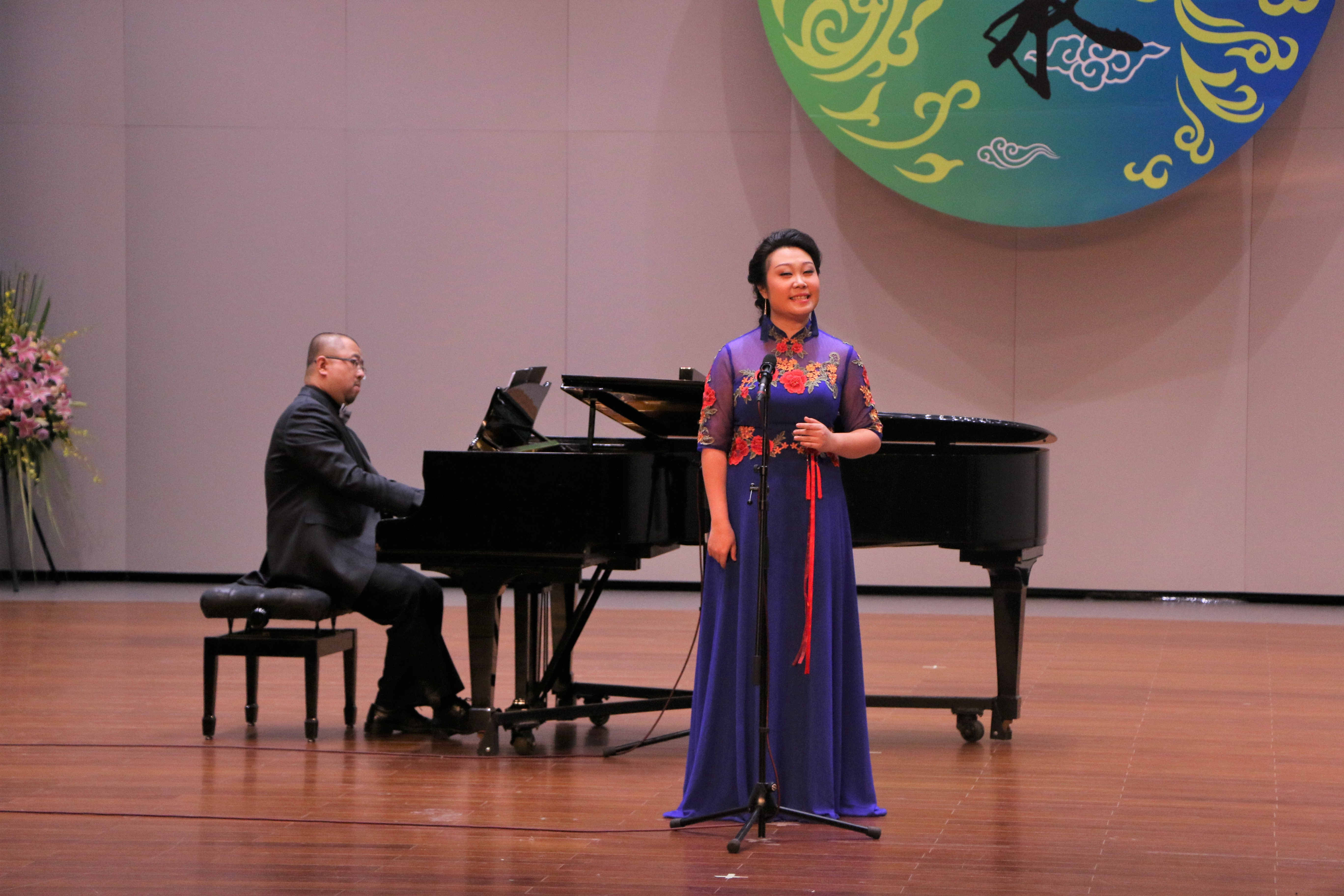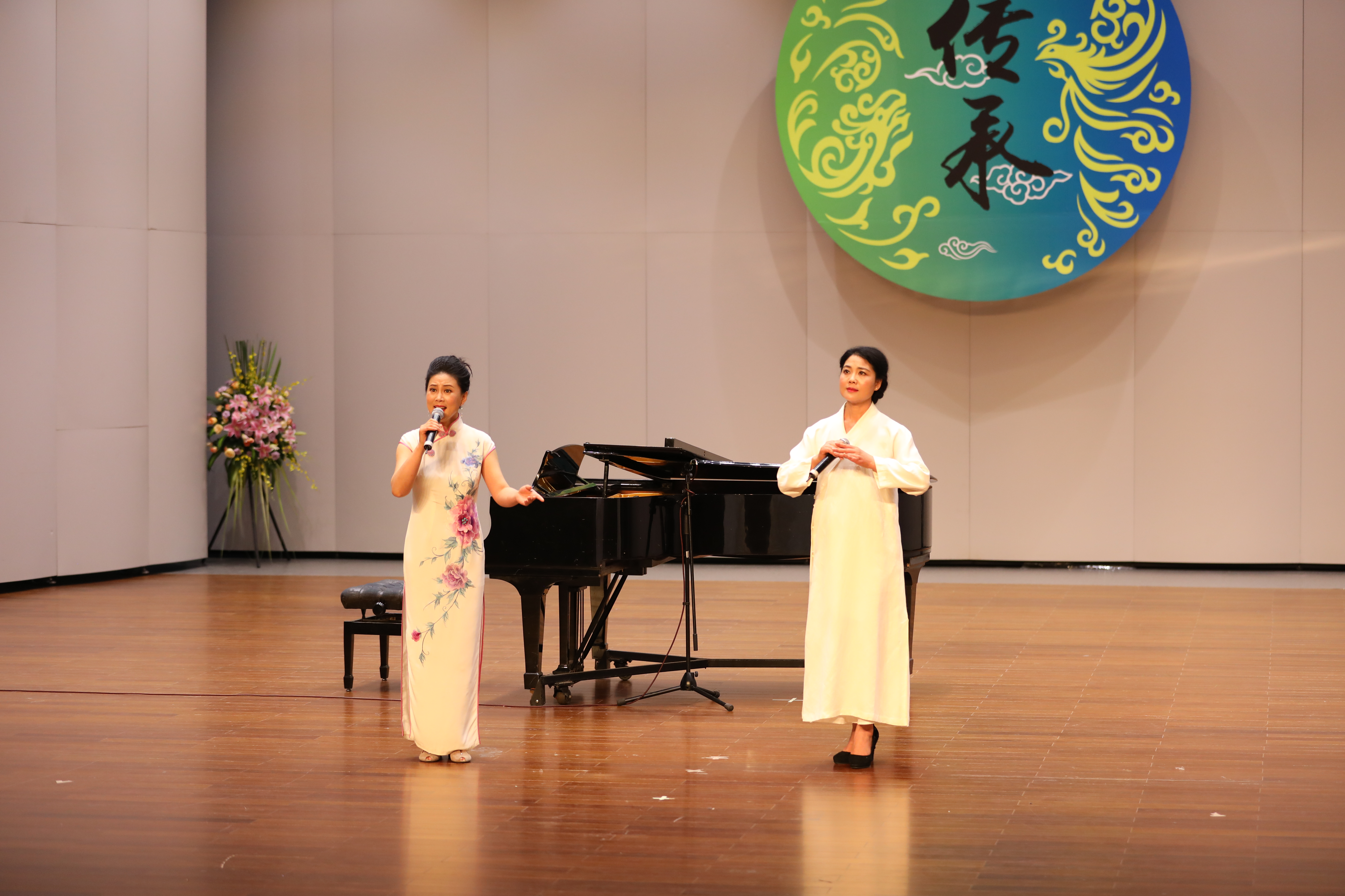 当晚浙江音乐厅大堂变成了花的海洋,花篮摆成了一条“花毯”,满眼望去都是祝胡素银音乐大讲堂暨师生音乐会圆满成功。胡素银为国家一级演员,第八届、九届浙江省政协委员,中国音乐家协会会员,浙江省音乐家协会声乐专业委员会顾问。曾是民盟浙江省委会委员,2005年11月荣获文化部“第七届区永熙优秀音乐教育奖”。对民族音乐文化和音乐表演艺术的执着,是70多岁的胡素银一直坚守与传承的。音乐会伊始,她提到中共中央办公厅、国务院办公厅印发的《关于实施中华优秀传统文化传承发展工程的意见》,就像一面旗帜,让她有底气在大讲堂上和大家交流中华民族优秀传统文化传承。传承发展工程最重要的是“人”,是教育,立德树人是根本任务。这就是讲座名称的由来。胡素银从1987年调入浙江艺术学校(现为浙江艺术职业学院)越剧科担任声乐老师讲起,讲述了一路走来,面对不同学生不同嗓音条件的开发,音乐教育理念在一代代学生身上的呈现,向观众传递民歌知识,讲述民歌故事。她说,自己一直以来坚信,做难事必有所得。民歌,需要有人记住,有人欣赏,有人传承。在这个时代,机会来了。