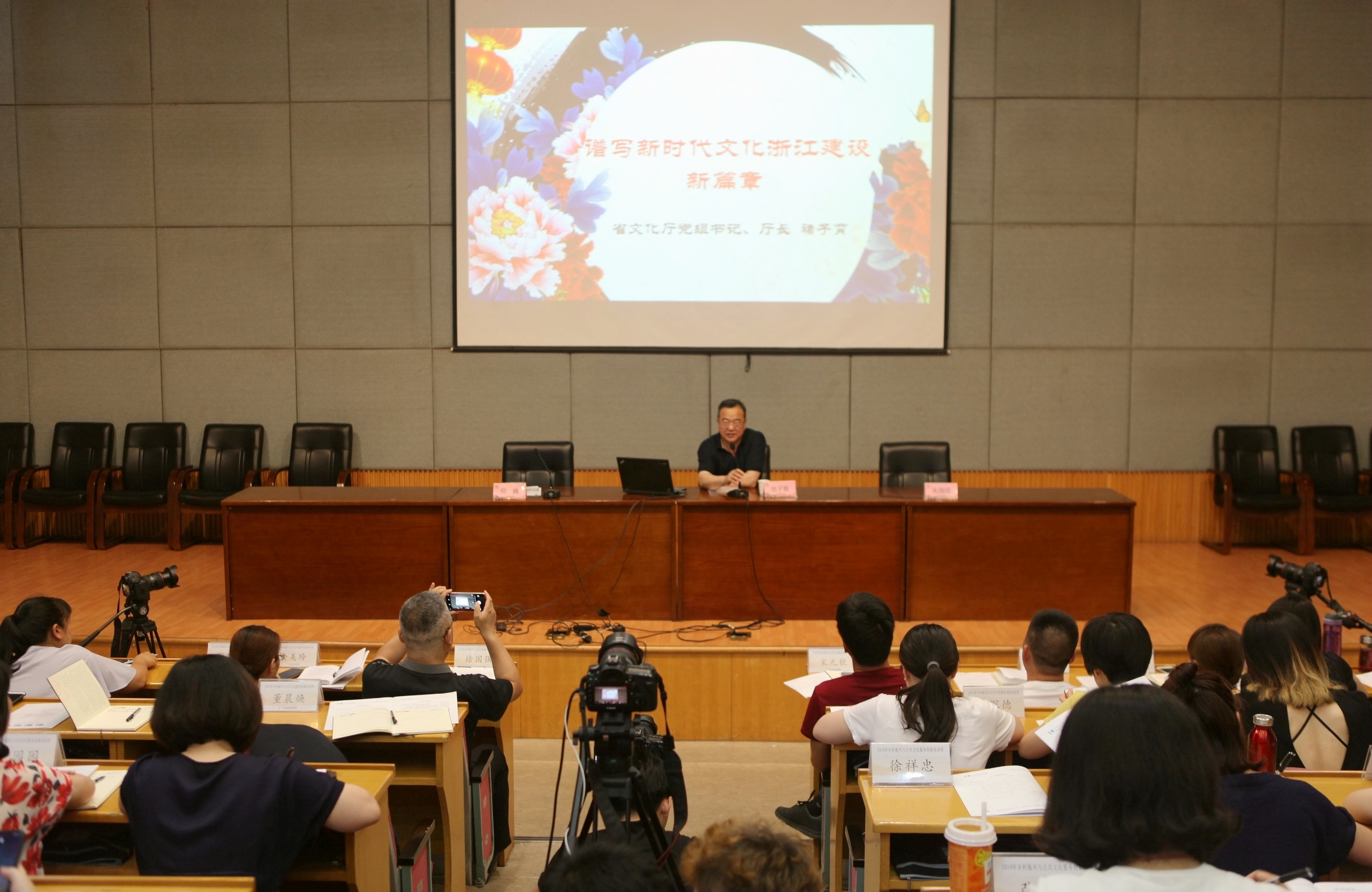 为推进文化助力乡村振兴,根据浙江省文化厅2018年干部培训计划要求,由浙江省文化厅主办、浙江艺术职业学院承办的2018年全省乡村振兴与公共文化服务创新培训班(第一期)6月19日下午在图信中心报告厅开班。浙江省文化厅党组书记、厅长褚子育出席开班仪式并作首场讲座,省文化厅公共文化处处长倪巍主持开班仪式,浙江艺术职业学院党委书记朱海闵主持讲座。全省乡镇(街道)文化工作分管领导、省级文化系统兄弟单位领导和校党委班子成员、处科级干部共同聆听专题报告会。