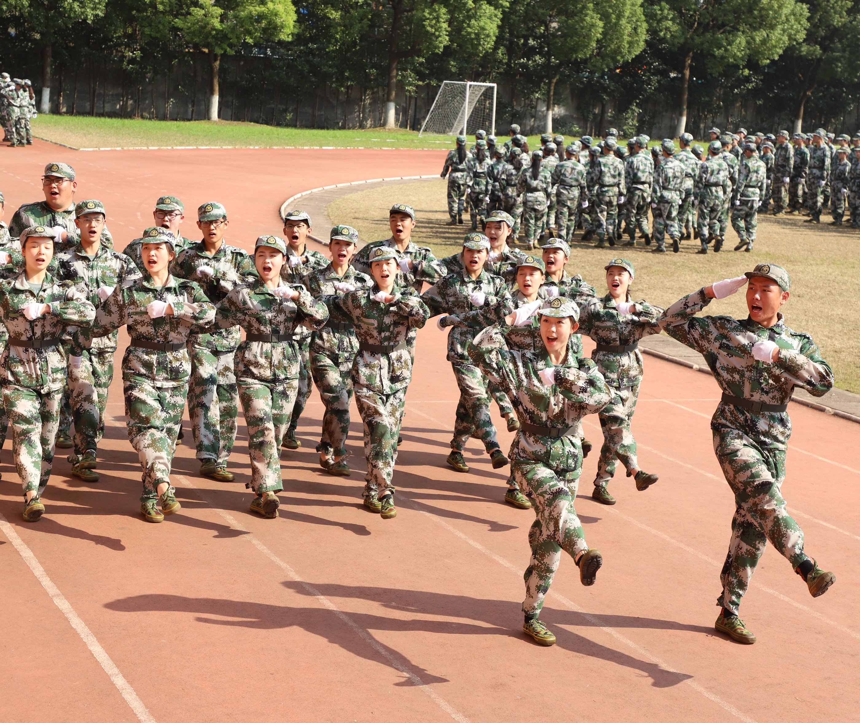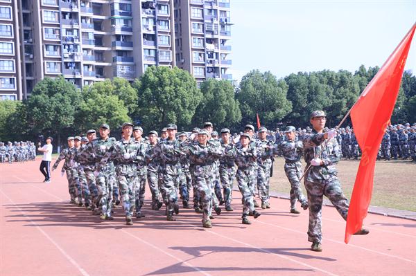 《义勇军进行曲》响起,全体新生用坚定的眼神凝望五星红旗缓缓升起,闭训仪式随即拉开大幕。党委副书记夏开堂代表学院党委检阅了新生军训队伍。各营排进行分列式军训汇报,“提高警惕,保卫祖国;扬帆把舵,奋勇拼搏,看我一排,气势磅礴;牢记担当,百炼成钢,再创辉煌……”,嘹亮的口号声在田径场上空回荡,这是发自内心的声音,响彻天空。经过军训的洗礼,同学们步伐有力、英姿昂扬,将这半月所学所练一一展现。方阵表演吸人眼球,军体拳表演、队列表演、战术表演,这支由各系最精英的成员组成的方阵,以精湛的军训动作展示,向老师和同学们致敬。