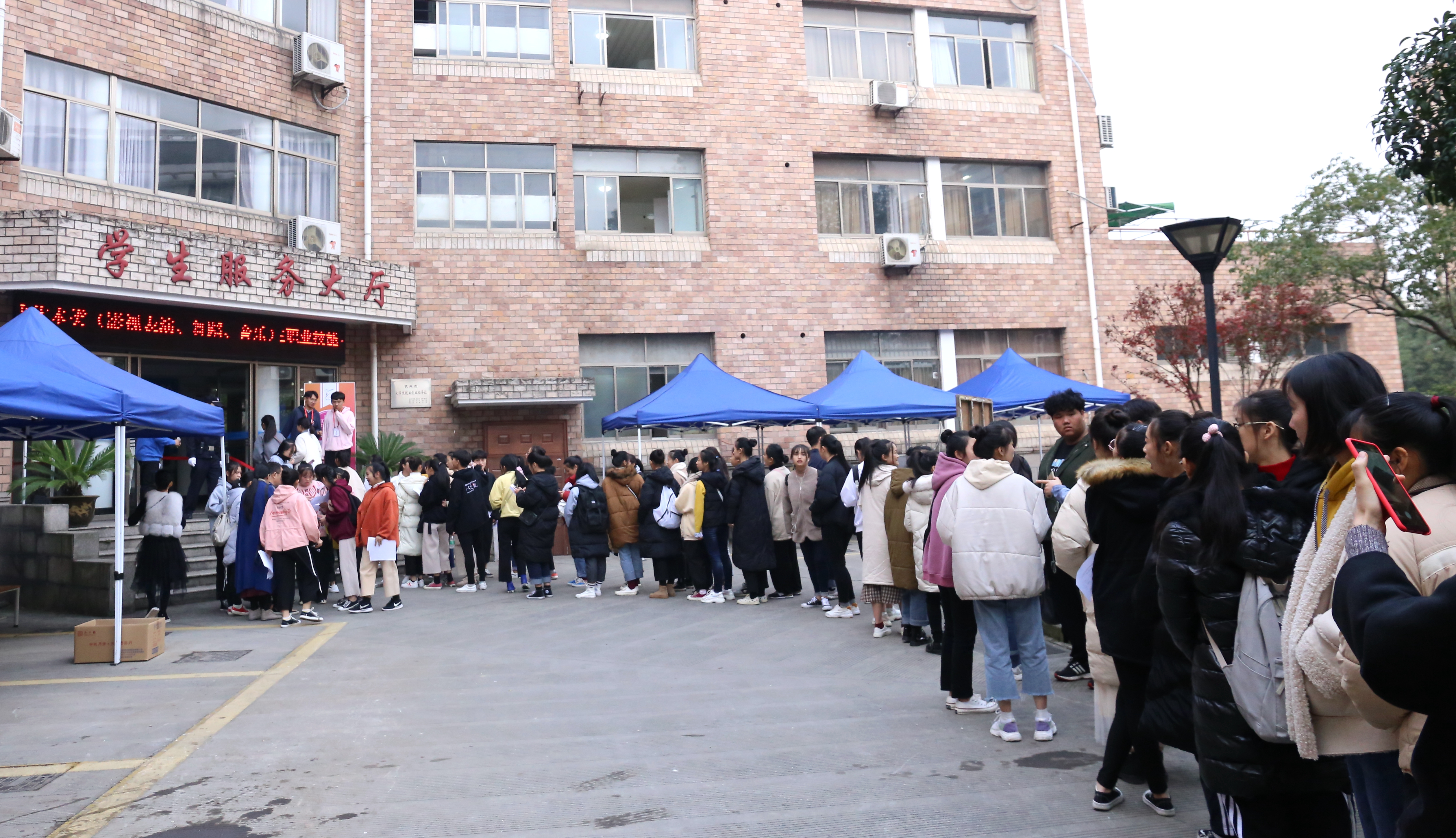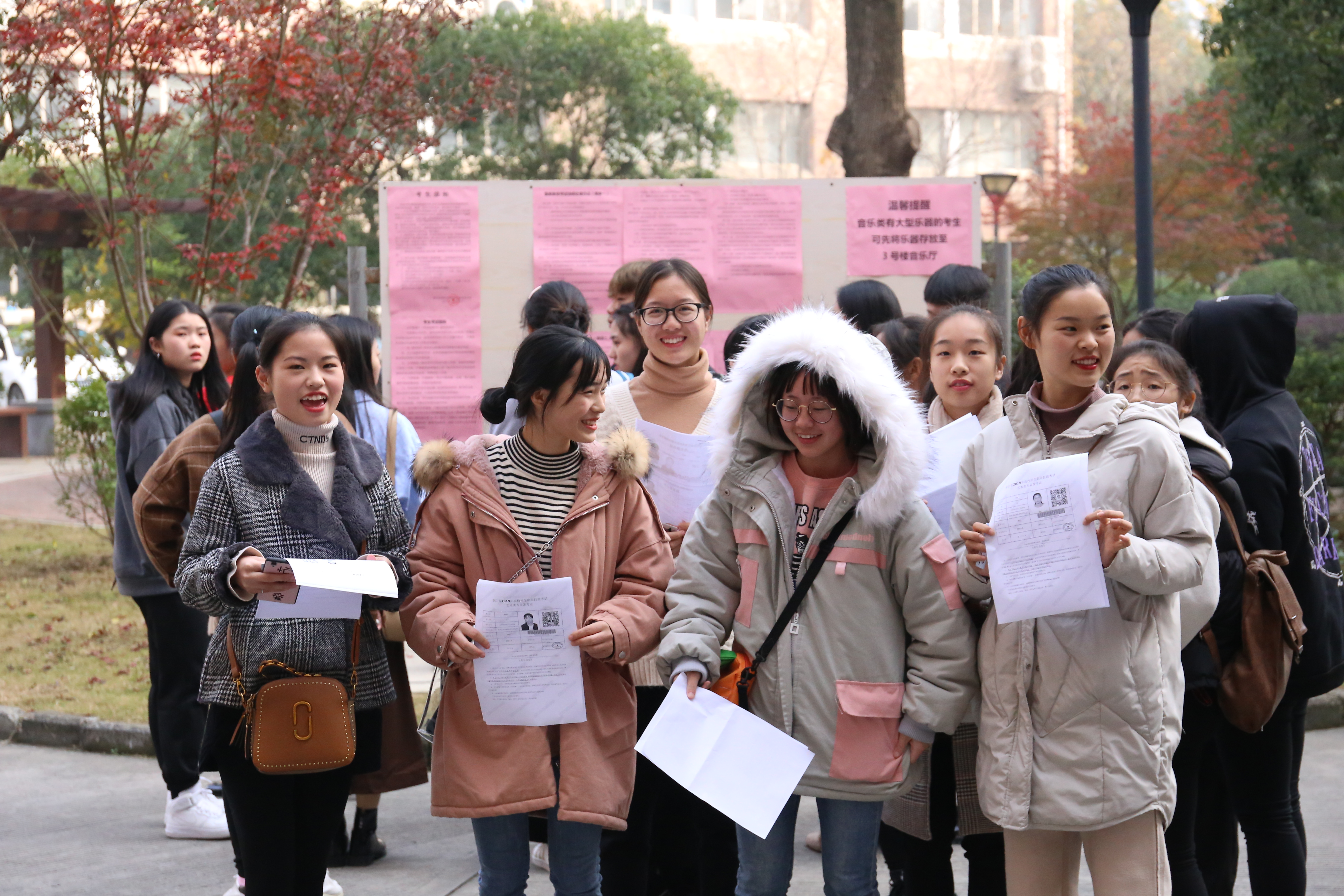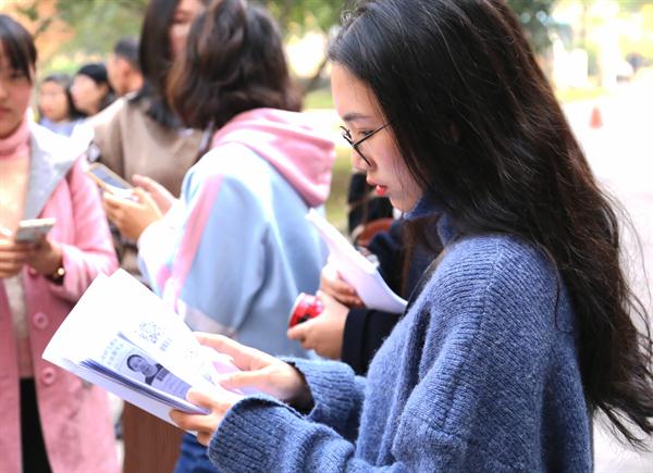秋冬时节的浙艺校园,金黄色格外醒目,中心广场两旁的银杏树将落叶洒落在脚下依然青青的草坪和蓝色的步道上,给冬日里的校园增添了几分温暖。今天(30日)是考生们报到的日子,一进校园,本次考试的导示牌便映入眼帘,交代了报到、候考、考场等具体信息。早晨刚开始时报到人数还不多,临近中午时出现了高峰期。考生们带着身份证、职业技能考试报名证等证件进行现场确认。