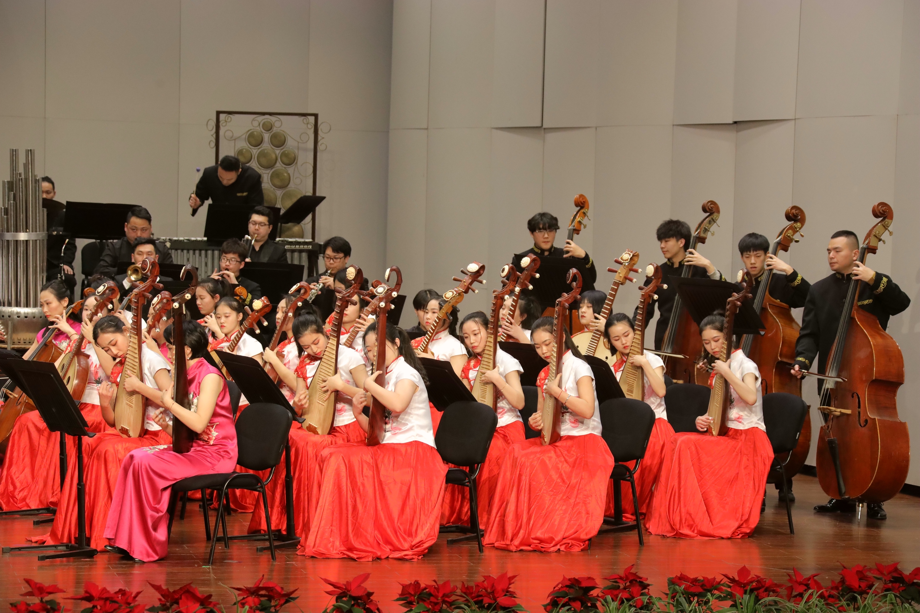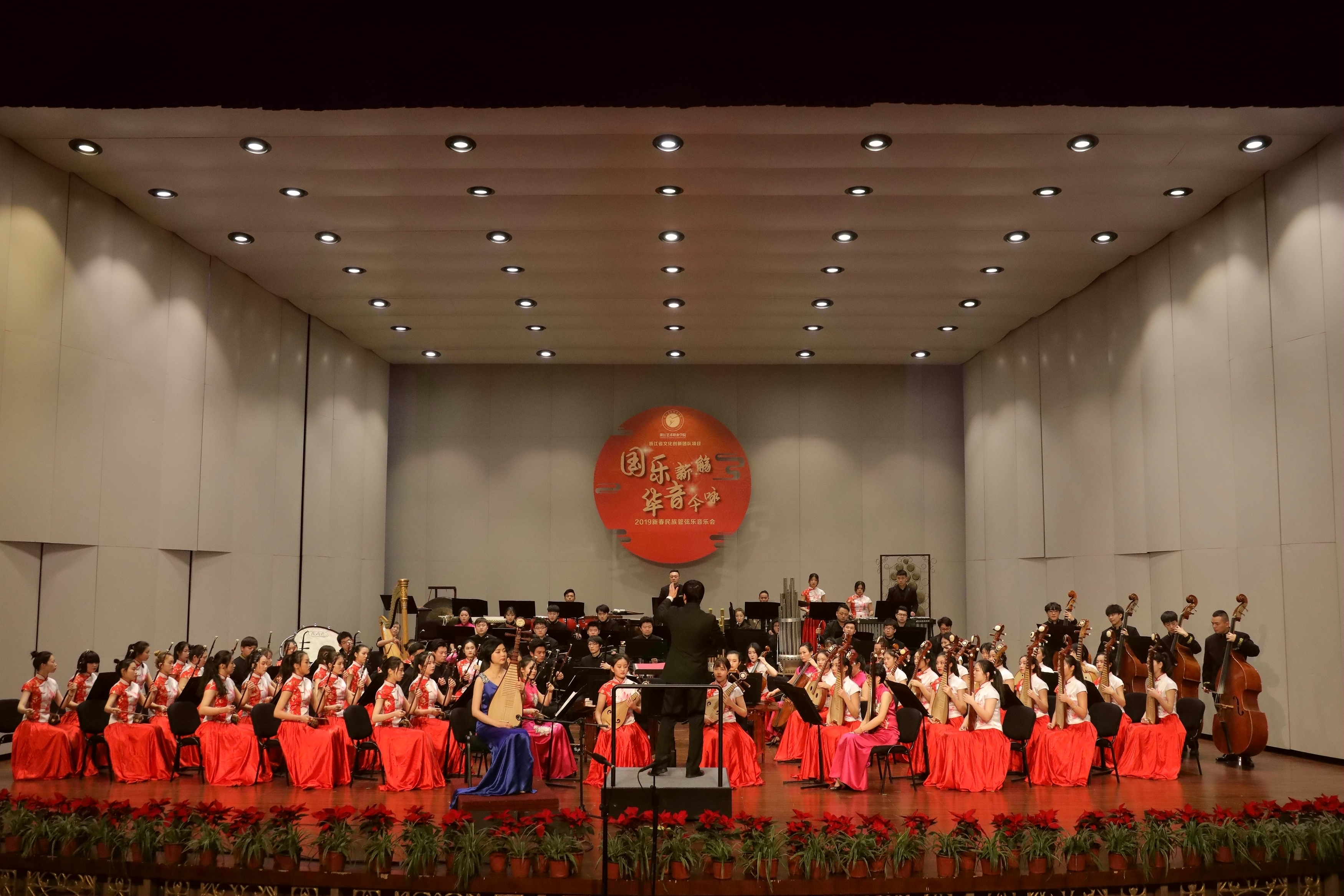 2019踏着欢歌声走来,由浙江省委宣传部、浙江省文化和旅游厅主办的2019浙江省属文艺院团新年演出季,1月8日晚在浙江音乐厅上演了2019新春民族管弦乐音乐会。音乐会由浙江艺术职业学院承办,国乐新觞,华音今咏,感染了现场观众。这是浙江艺术职业学院继10月张凌琵琶独奏音乐会、11月吴樟华竹笛独奏音乐会后,再一次在浙江音乐厅奏响国乐之音。