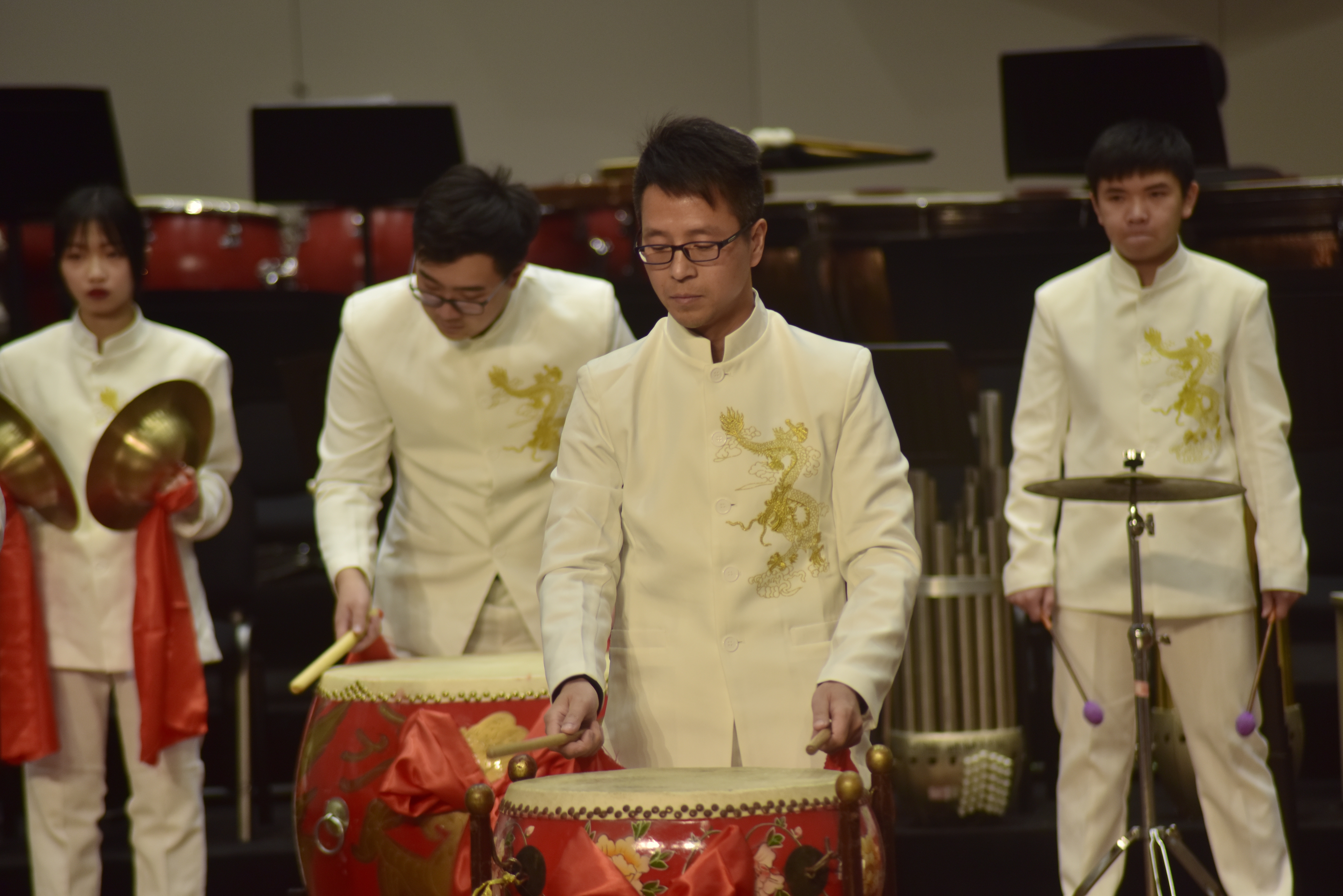 打击乐合奏《黄河船夫》是整场音乐会最具震撼力的节目,此曲采用民族打击乐合奏的形式,展现出船夫们的豪迈气概。担任打击乐领奏的是青年教师陈利宏,在他的引领下,20余位演员用精湛的技艺和极富表现力的肢体动作征服了台下观众,现场响起热烈掌声。