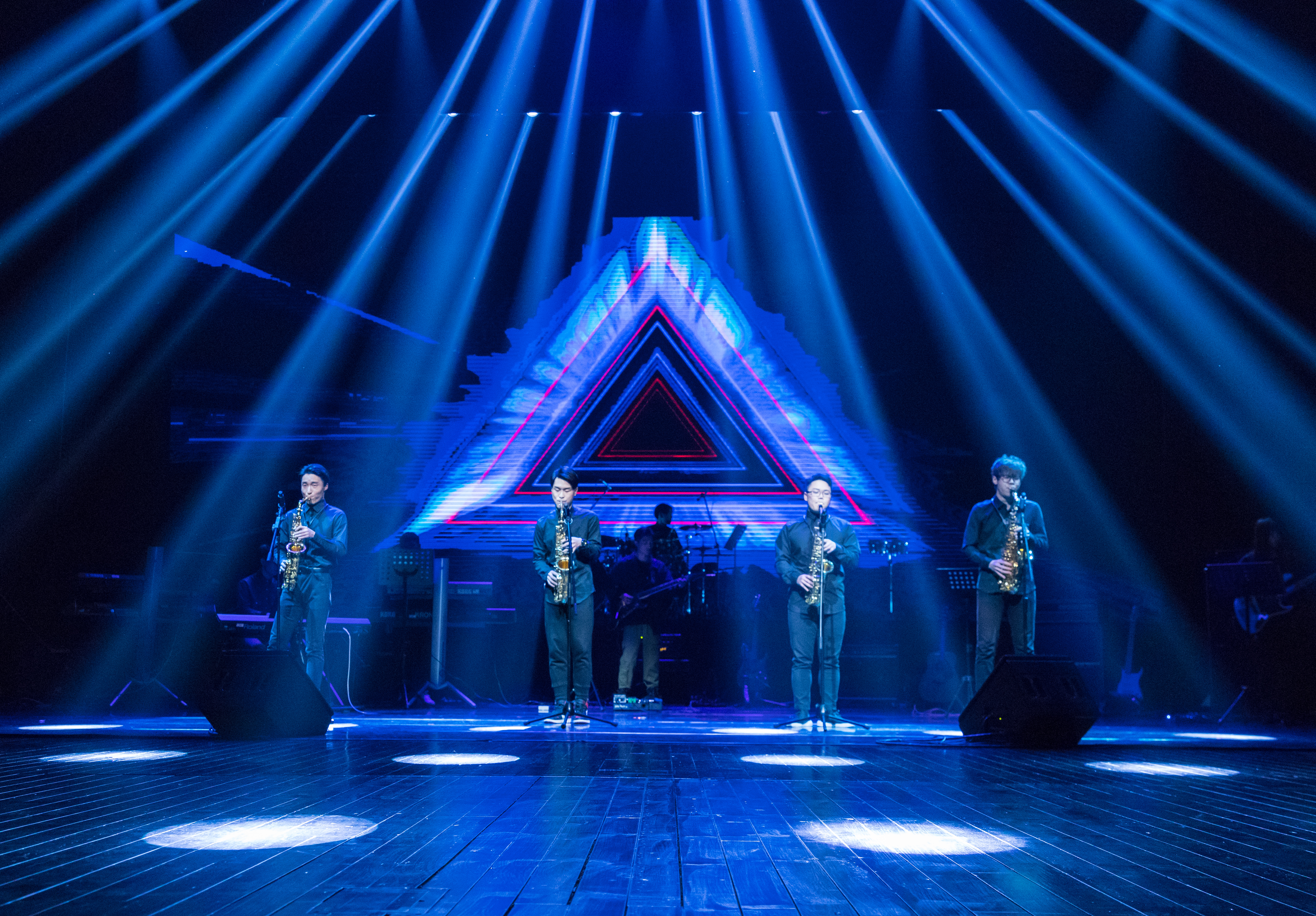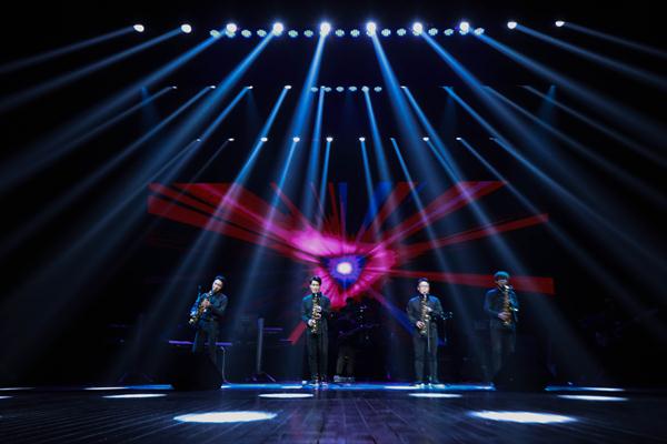 开场节目萨克斯重奏《TRUTH》一经亮相便迅速点燃了场内气氛,四个声部的萨克斯将美妙和音交织在一起,律动感十足的节奏带动了台下观众的热情,全场观众挥舞着手中的荧光棒,跟着节奏一起摇摆。