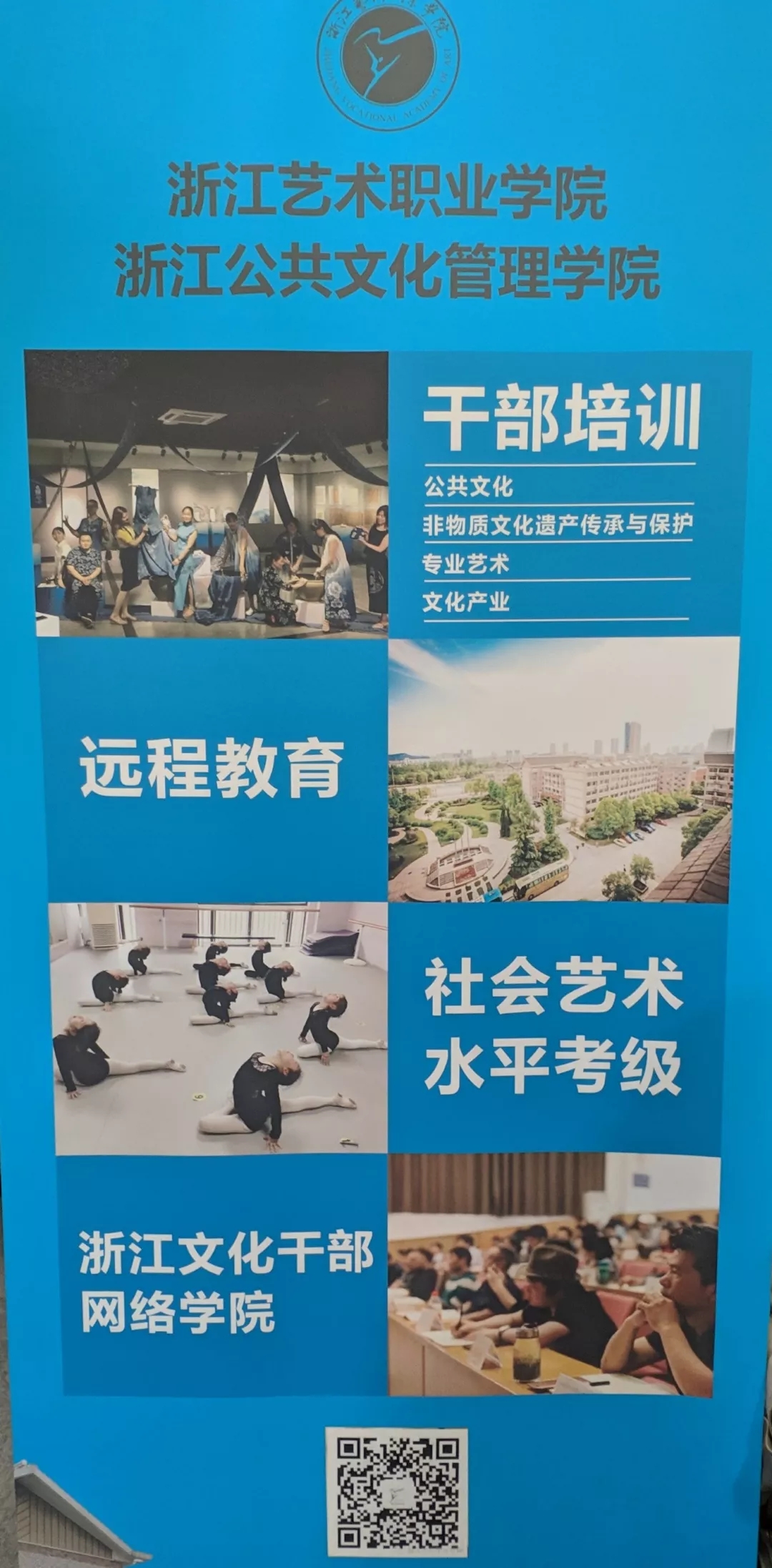 我校参加的是第四展区(政策咨询、培训、绩效评价)展示。浙江艺术职业学院培训基地,是全国文化干部培训基地、全国基层文化队伍培训基地、全国文化信息资源共享工程培训基地、浙江省专业技术人员继续教育基地、浙江文化行业特有工种职业技能鉴定站和培训基地。近年来,基地围绕社会主义文化繁荣兴盛需要,紧扣学校人才培养中心工作,坚持学历教育与人才培训相结合,高质量承办完成文化和旅游部、浙江省文化和旅游厅各项培训任务,培养和造就一大批德才兼备、锐意创新、结构合理、规模宏大的文化人才队伍。