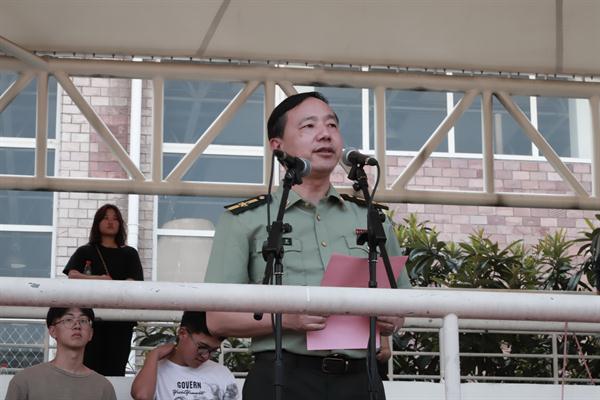 刘朝武讲话。他对新生们表示热烈祝贺。他希望新生们从军训开始实现人生的跨越,担负起历史使命,以一名真正军人的标准严格要求自己,不畏艰难,增强体魄,收获友谊。通过此次军训,学会关心他人、关心集体,每天学会总结,增强自己的精神力量,养成高尚的道德情操。