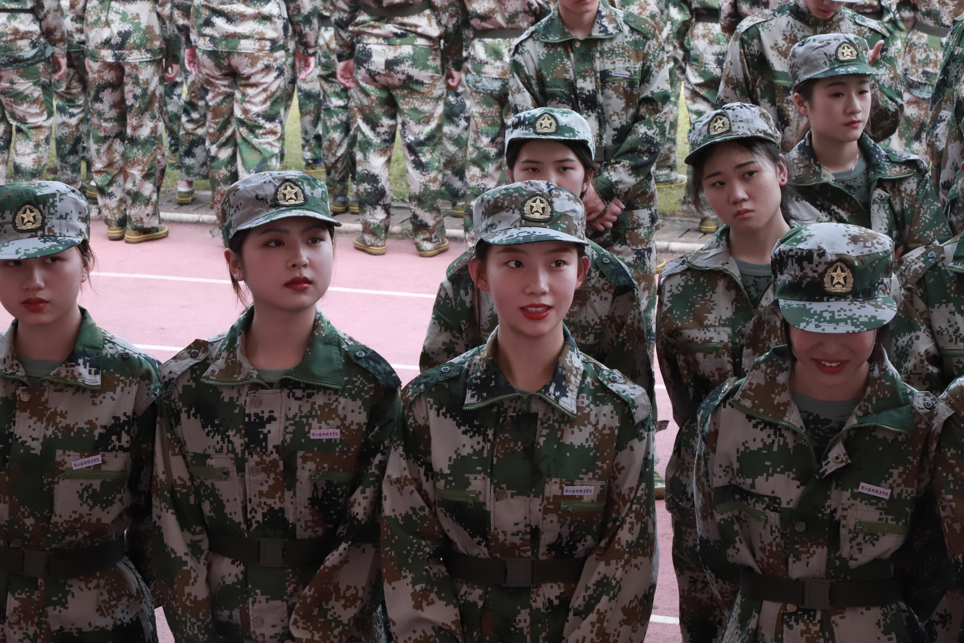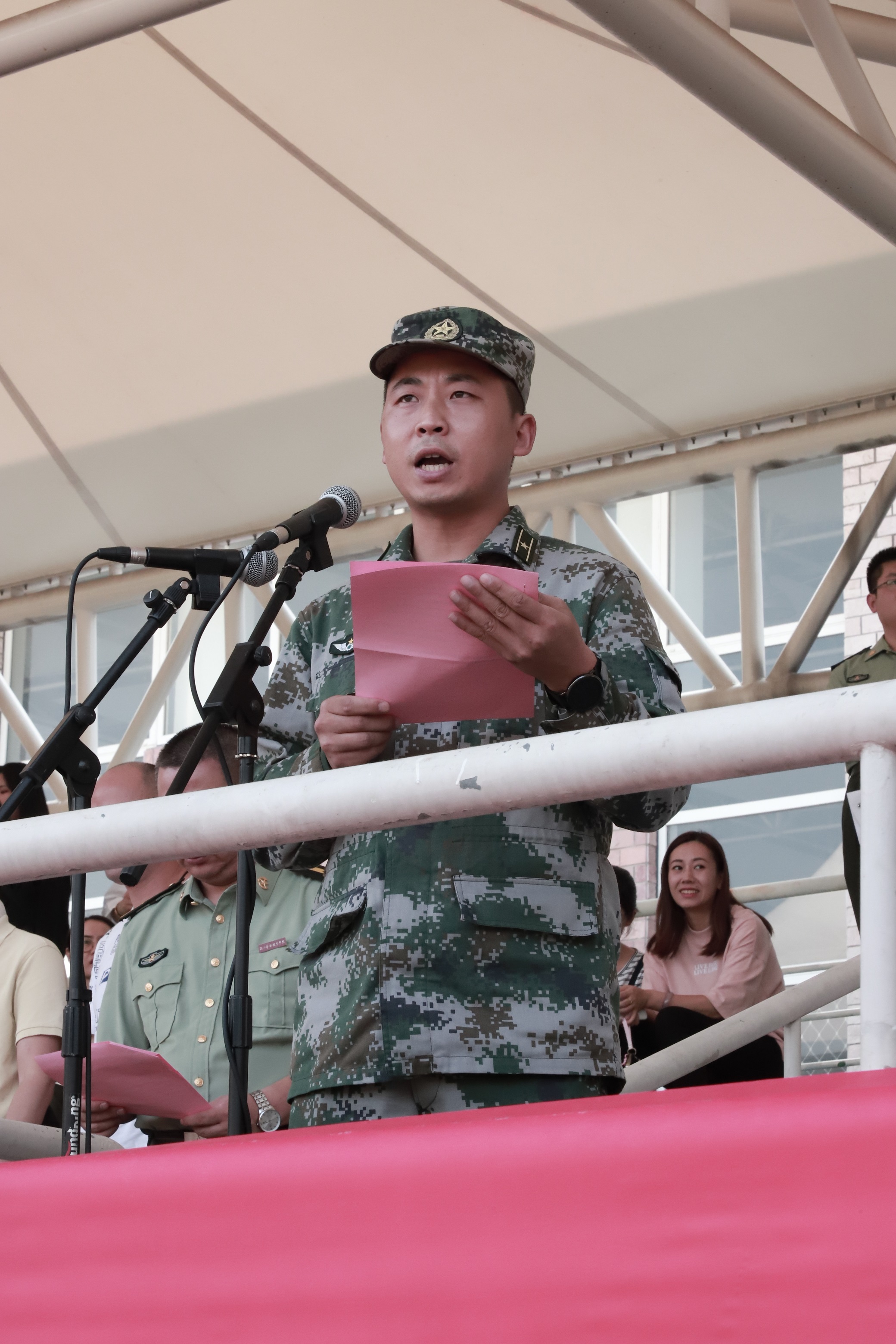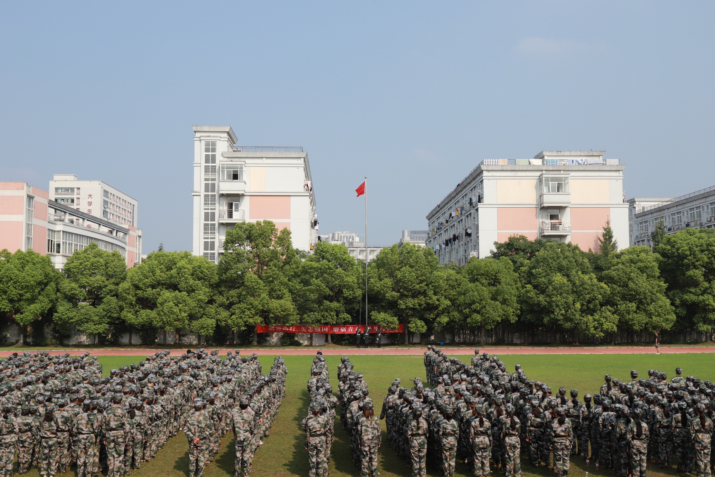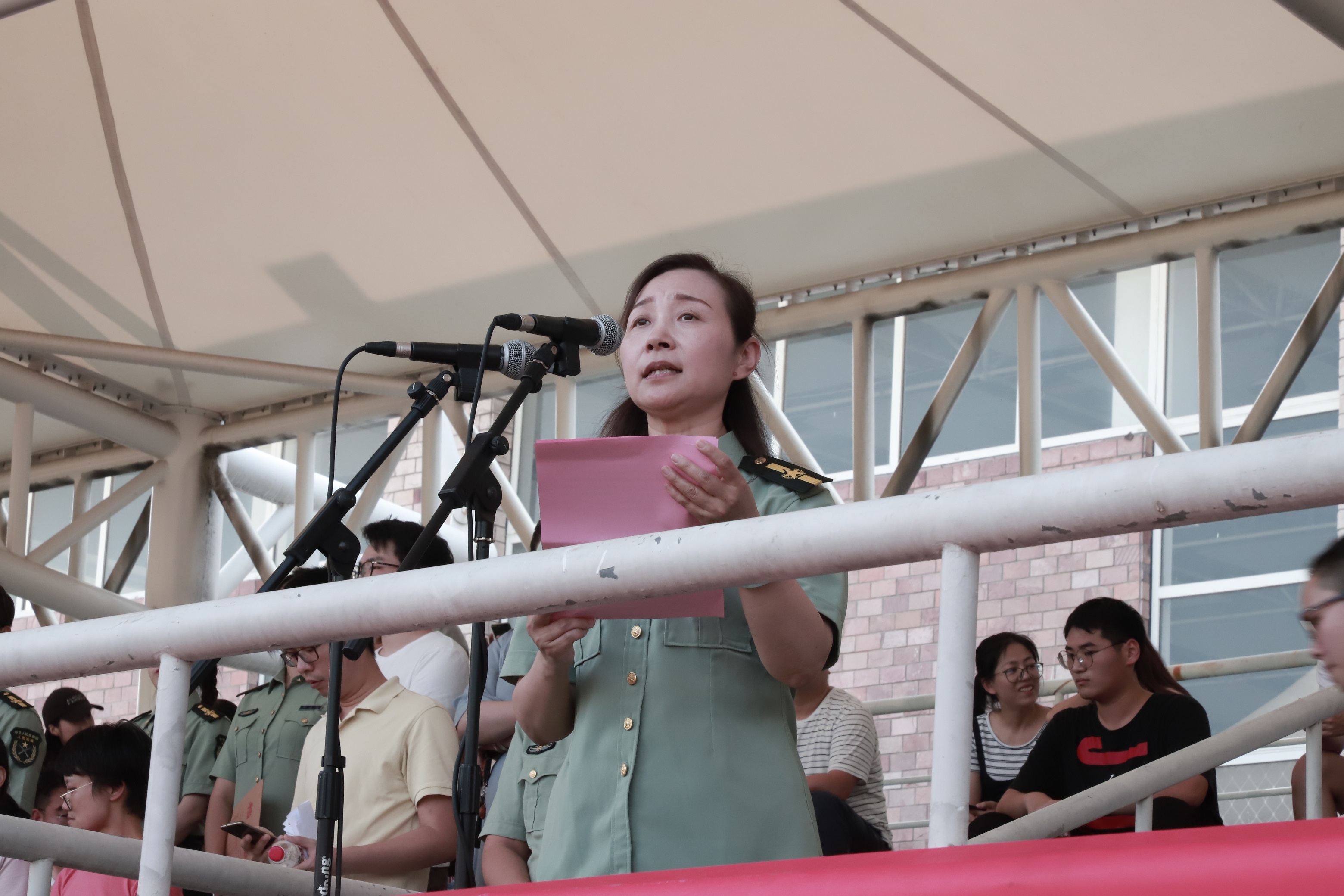 黄杭娟讲话。她向承担今年军训工作的中国人民解放军某部队及各位官兵致以崇高敬意和衷心感谢,对跨入我校学习的1108名新同学表示热烈祝贺。学校开展军事训练,是大学生在校期间接受国防教育、树立爱国主义、集体主义和革命英雄主义的一个基本形式,是我国国防和军队建设培养大批高素质后备人才的有效举措。一直以来,我校非常重视大学生的军训工作,邀请经验丰富的承训部队,精心安排训练计划,细致做好各项服务,每届参训学生的政治觉悟、理想信念、思想品德、作风纪律、军事技能、国防观念、身体素质等各方面都得到了锻炼和提高。黄杭娟对新生们提出三点希望:提高认识,居安思危,牢固树立保家卫国的国防意识;严明纪律、听从指挥,牢固树立令行禁止的纪律意识;端正态度,自立自强,牢固树立互帮互助的团队意识。