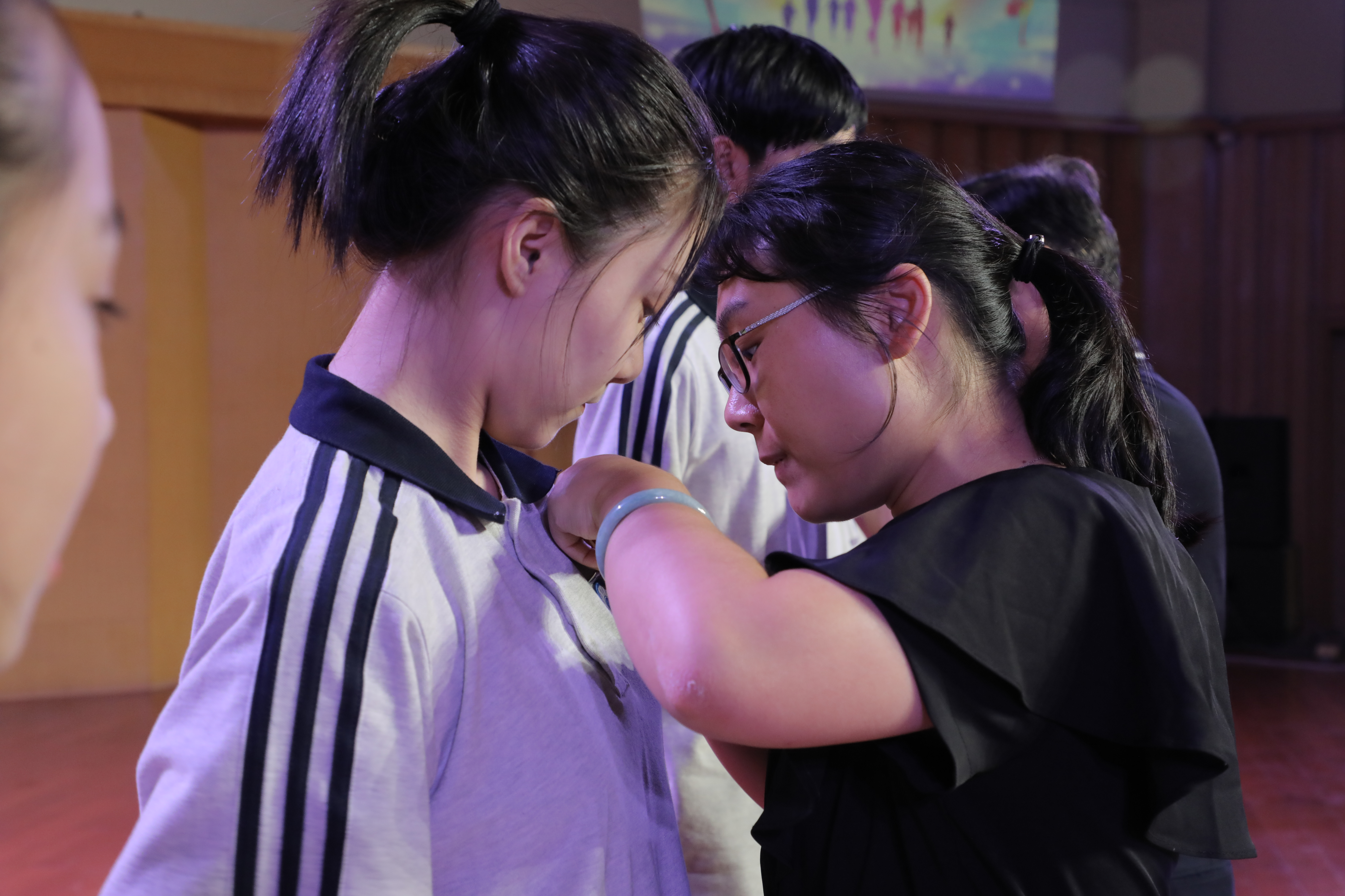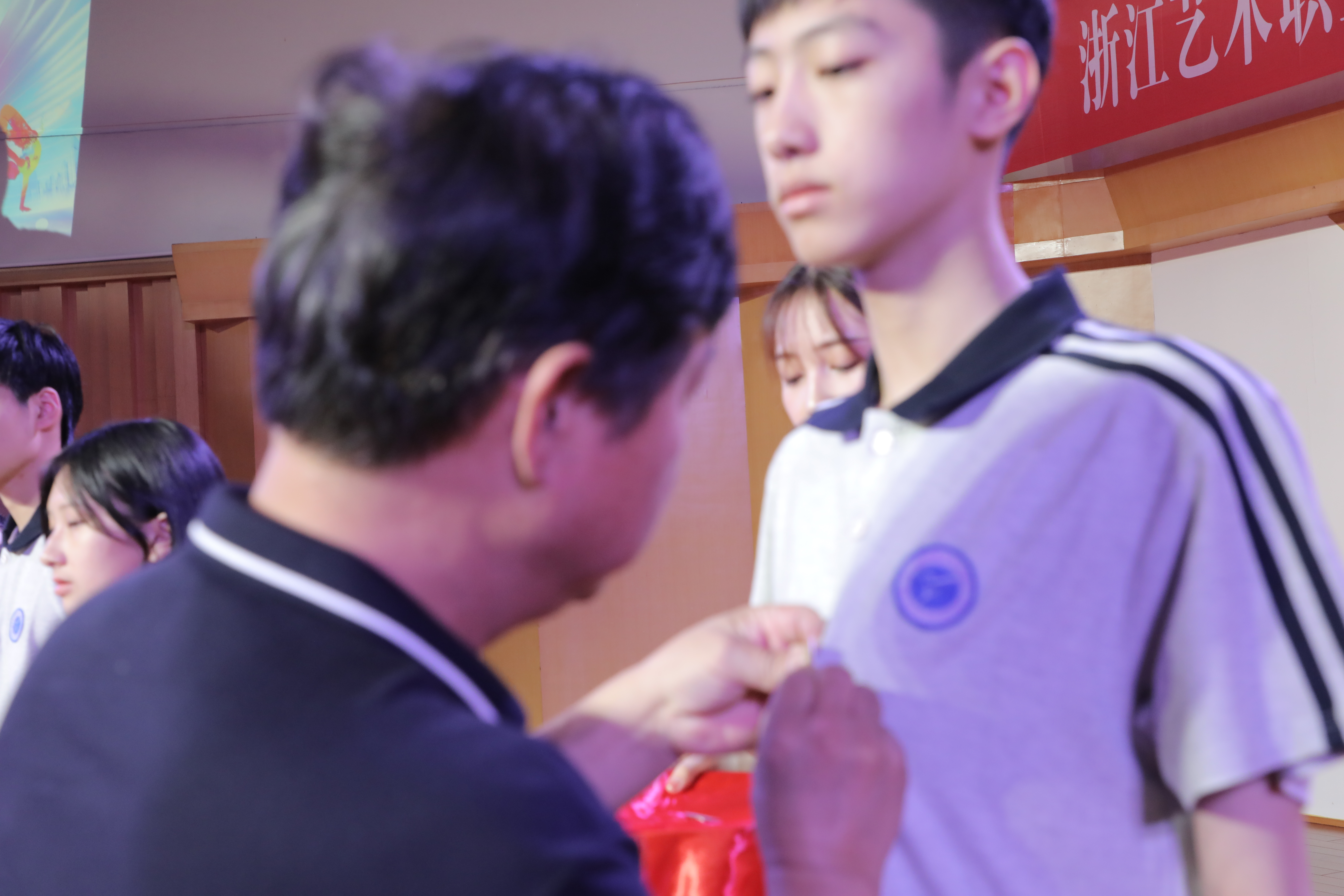 现场,戏剧系、音乐系、舞蹈系领导为新生佩戴校徽。