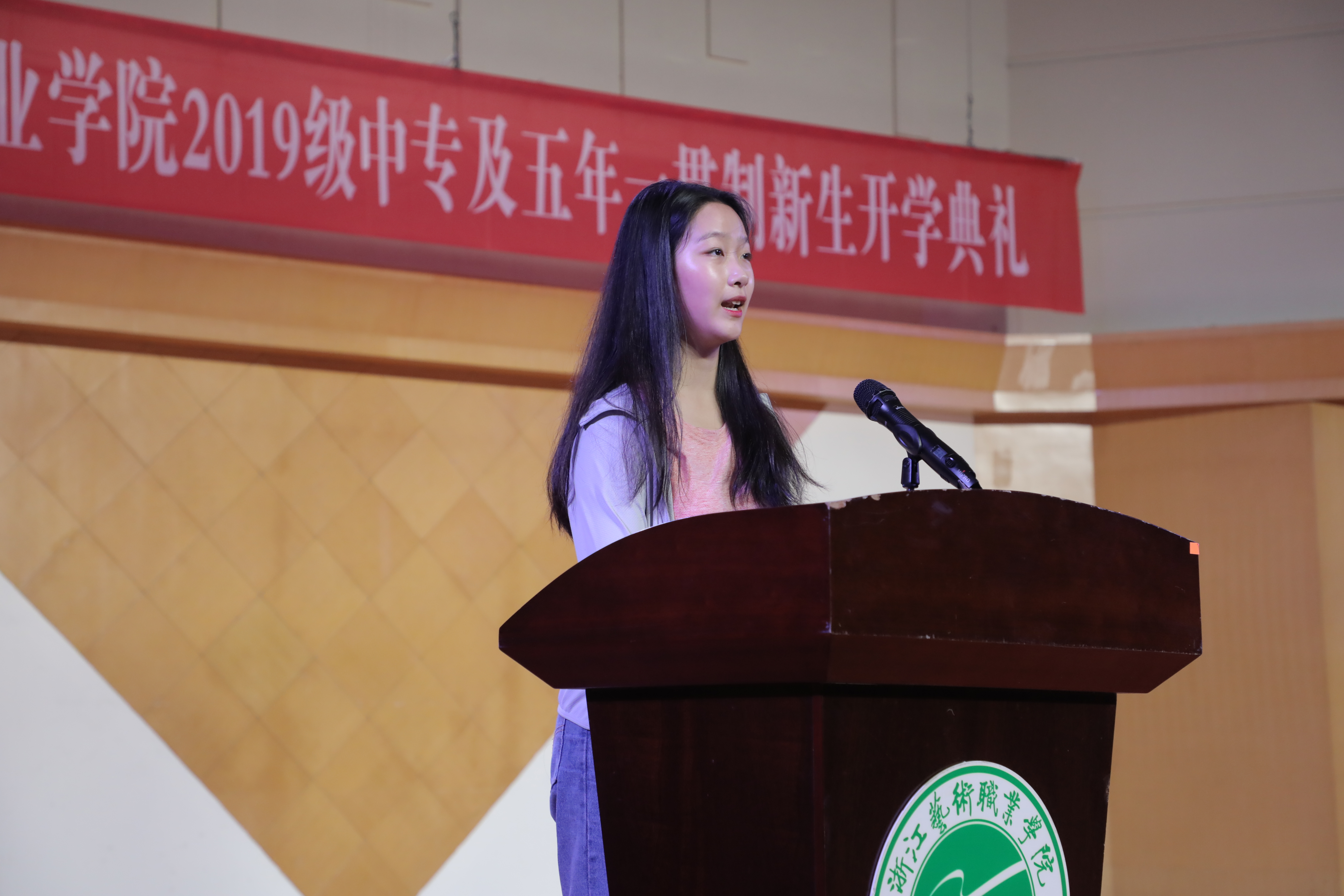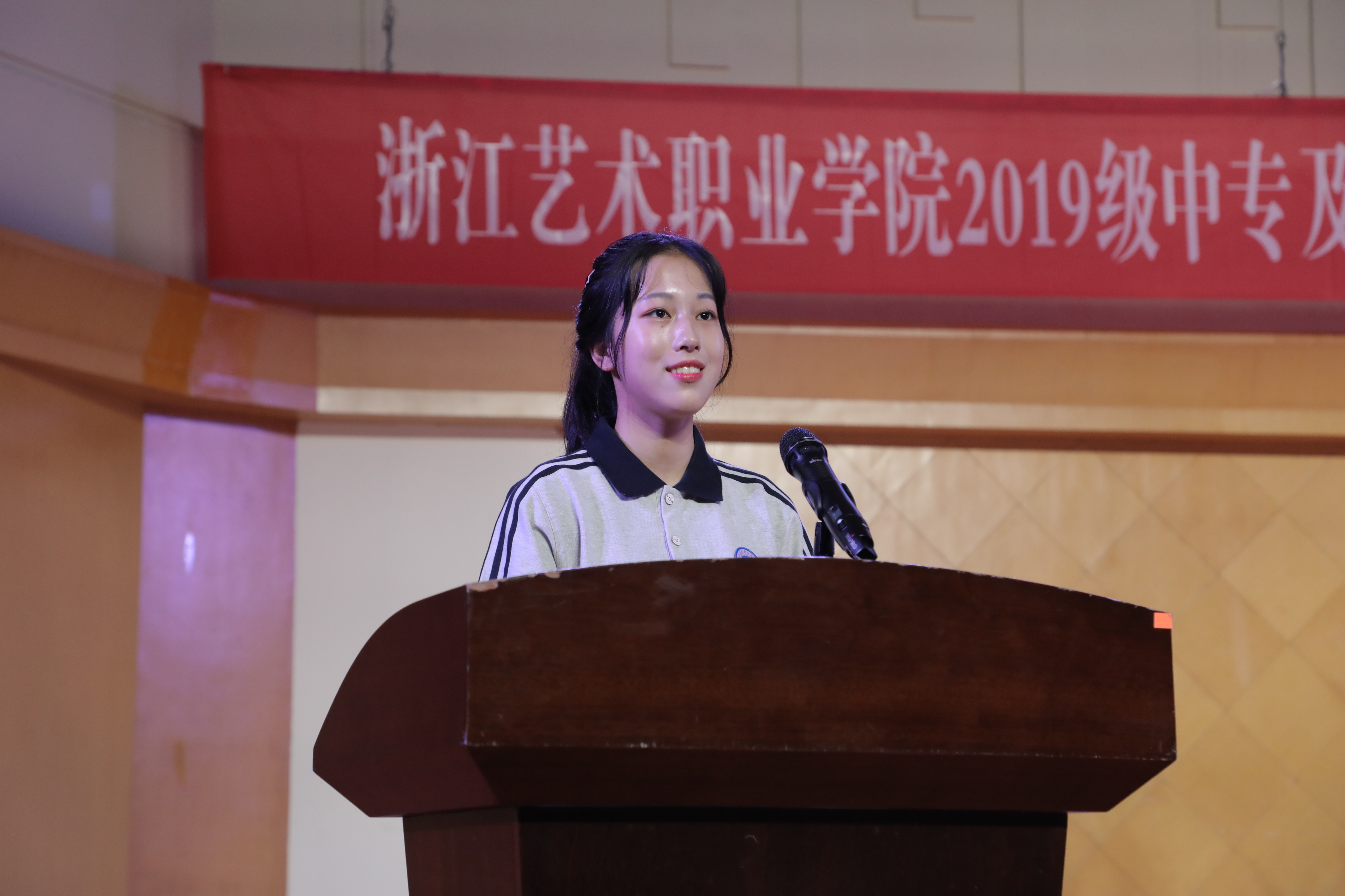 2019级音乐剧班刘思奇作为新生代表发言,表达了自己努力学艺,争取成为一名德艺双馨的艺术人才的愿望。