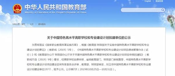 10月25日,教育部网站发布教育部、财政部《关于中国特色高水平高职学校和专业建设计划拟建单位的公示》,来自全国的197所高职院校榜上有名,其中,高水平学校建设单位共计56个,高水平专业群建设单位141个。浙江艺术职业学院位列高水平专业群建设单位名单,为全国唯一一所入选的综合性高职艺术院校。