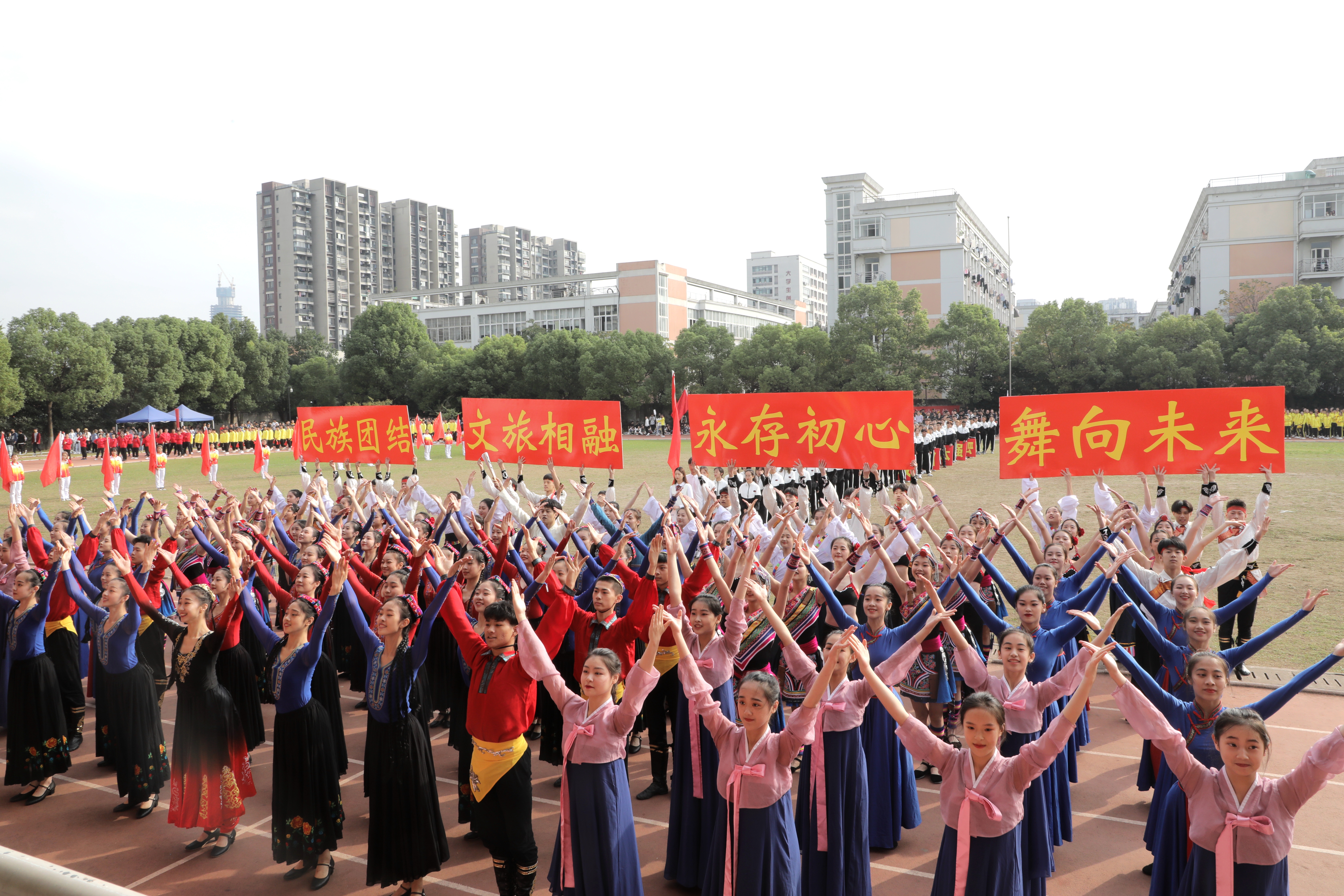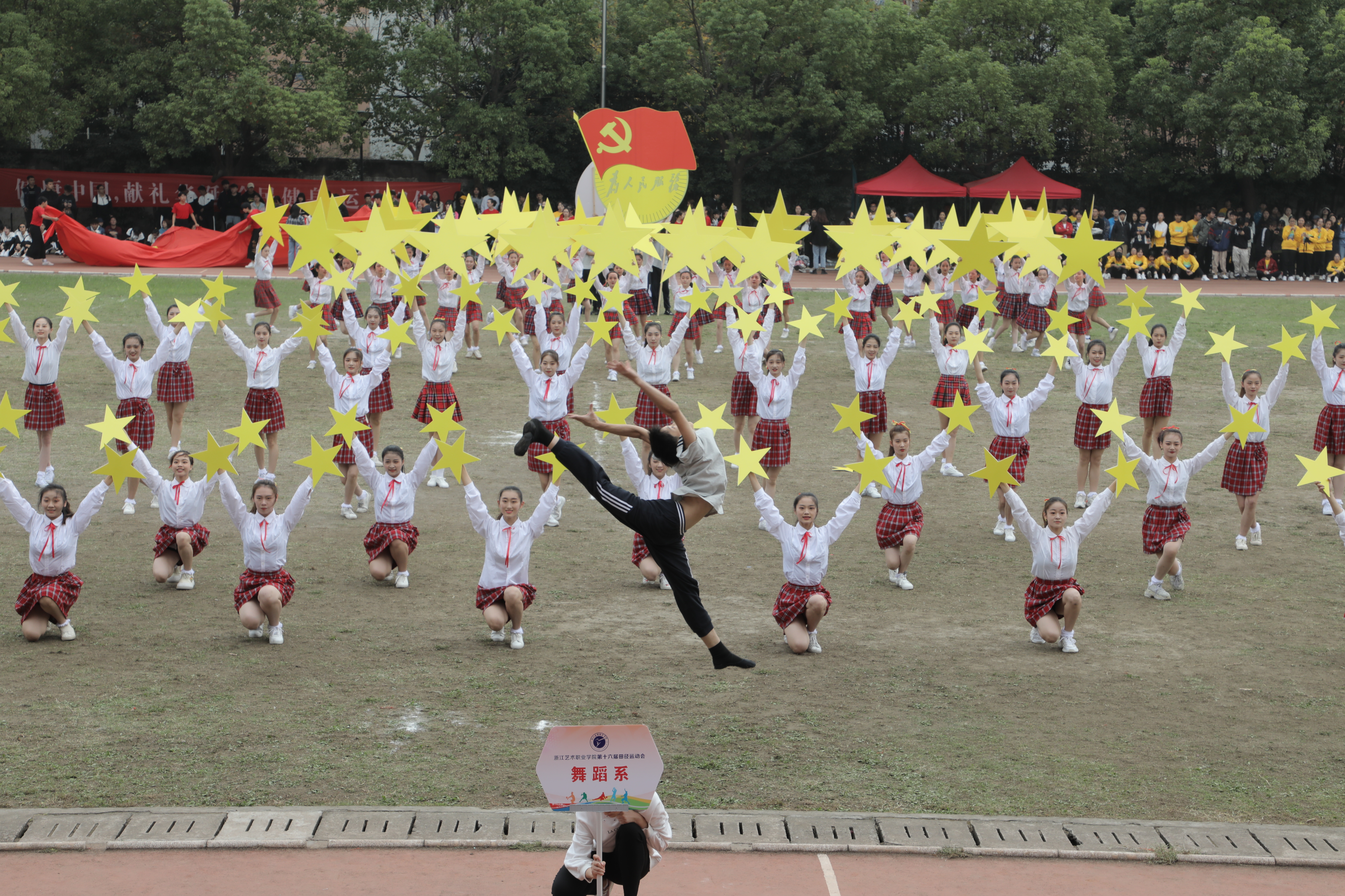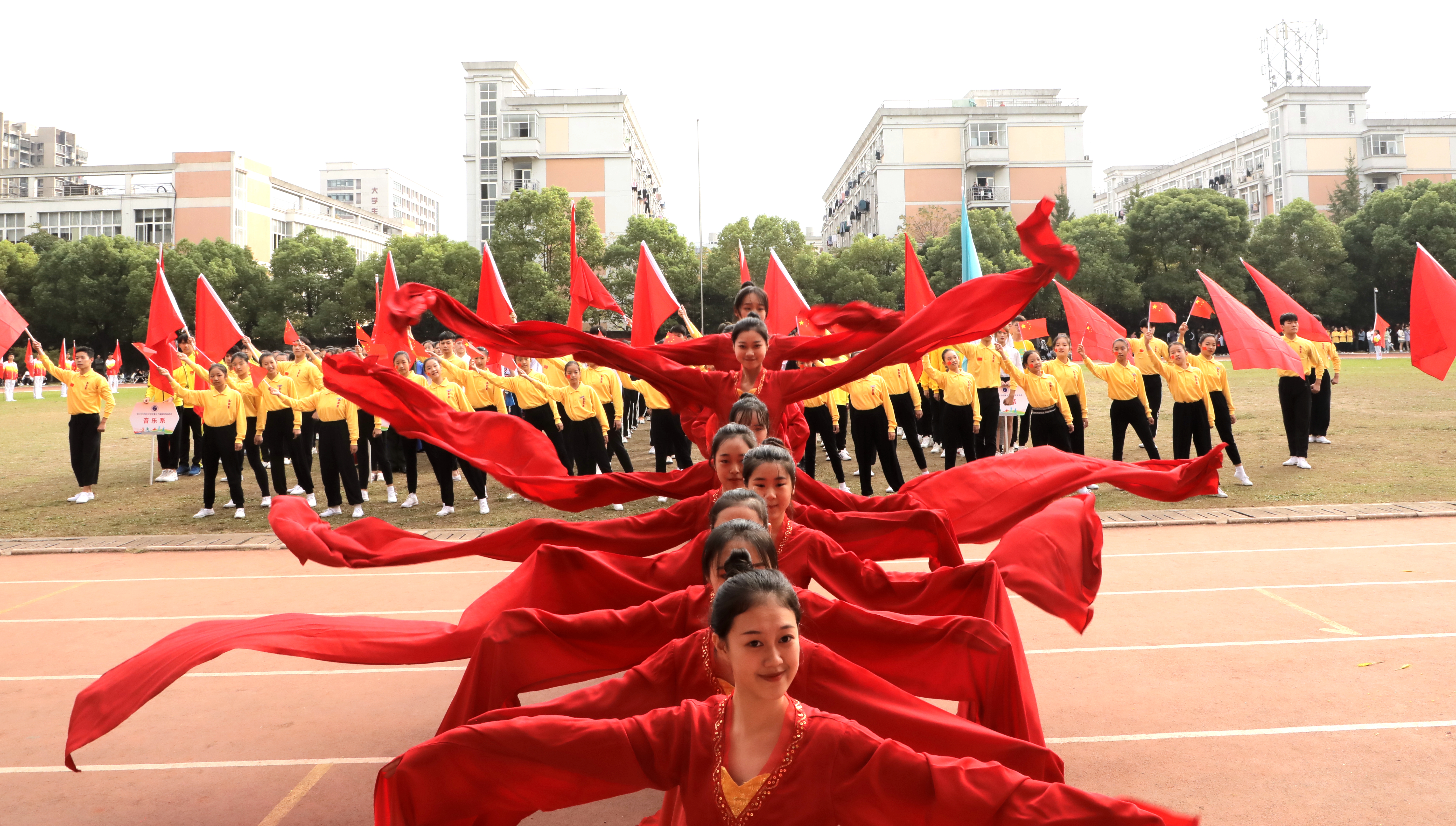 10月17—18日,学校举行了第16届校运动会中,运动会充满了爱国情怀,突显时代主题。如入场式环节,文化管理系展现了“红色梦想”,体现守初心、担使命的时代精神;舞蹈系展示了民族团结、文旅融合;影视技术系表达了争做新时代红色影视追梦人愿望;音乐系通过音乐节拍回顾新中国成立重要节点;美术系致敬中国共产党带领中国人民历经磨难走向新时代;戏剧系展现了浙艺人传承中华优秀传统文化的决心和担当。如团体操环节,各系将新中国成立70周年主题融入团体操编排,通过国旗、红飘带、五角星、向日葵、体操球等元素融入,呈现了一场别样的主题展示。如音乐系团体操《天耀中华》,用声乐、舞蹈、打击乐祝福新中国成立70周年,展现了“不忘初心、牢记使命”的责任担当。舞蹈系以学生技能展示出五角星闪闪发亮,体现浙艺精神代代相传,一颗红心向党走,少年有梦在远方。