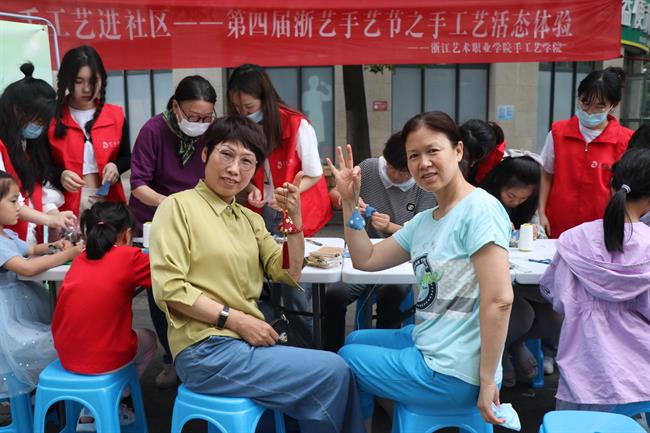 ▲浙艺师生走进东信社区,带领居民体验端午香包、创意扎染、创意扇面、剪纸等非遗技艺