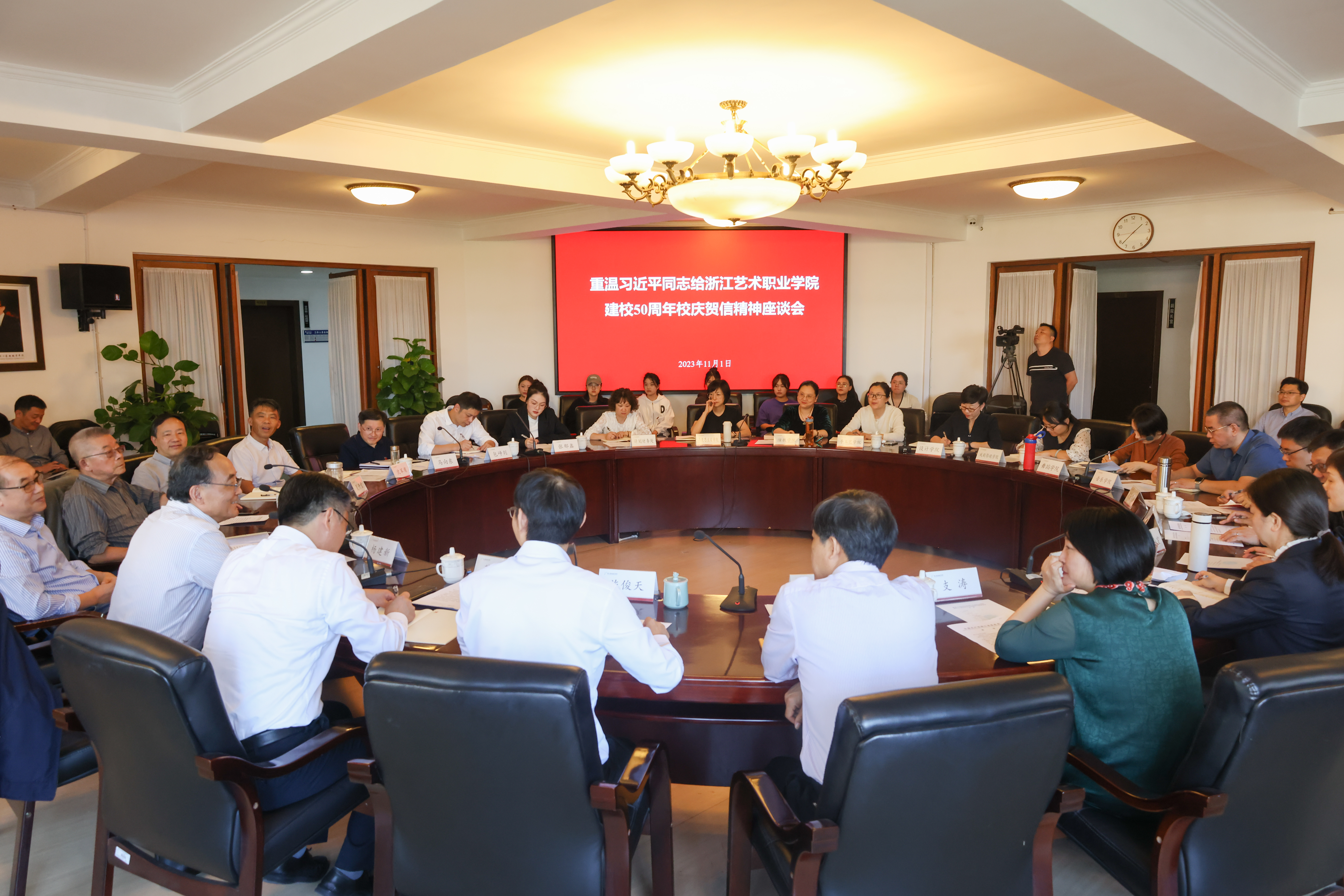 为进一步学习贯彻习近平同志致浙江艺术职业学院建校50周年校庆贺信精神,激励全校师生牢记嘱托、感恩奋进、勇立潮头、再创新绩,11月1日下午,重温习近平同志致浙江艺术职业学院建校50周年校庆贺信精神座谈会在我校举行。原浙江省文化厅党组书记、厅长杨建新,浙江艺术职业学院原党委书记林国荣,浙江艺术职业学院原院长、党委副书记何志云,校党委班子成员出席座谈会,座谈会由院长、党委副书记施俊天主持。