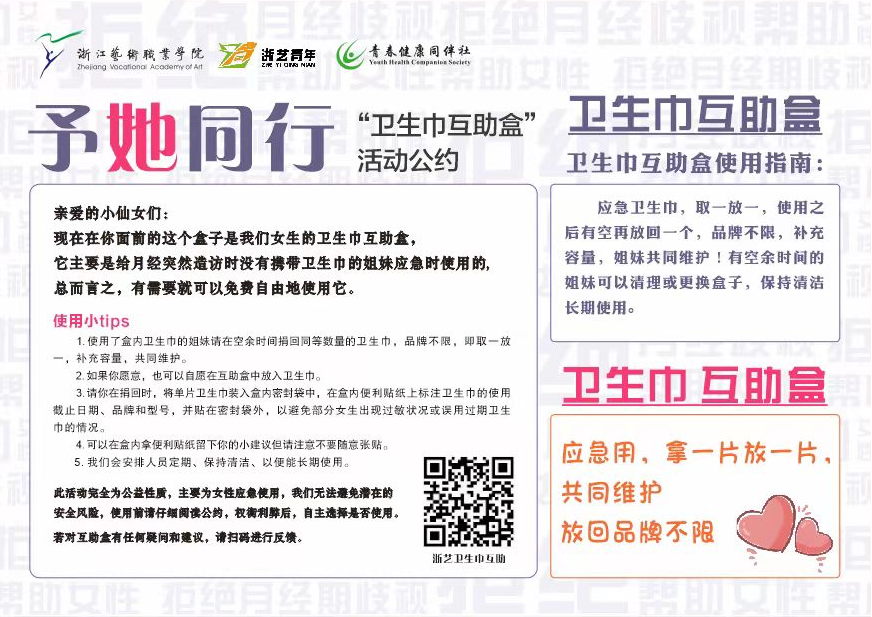 新生音乐会为新生提供了一个展现自我的平台,表达对未来大学生活的美好期待,开启他们在校期间的精彩篇章;“青春健康杯”三球一赛举办,篮球赛,羽毛球赛以及乒乓球赛,本着“友谊第一,比赛第二”的原则,在赛场上挥洒汗水,诠释最热血的青春;防艾知识讲座通过具体案例的介绍,促使大学生们进一步认识艾滋、防范艾滋;生理卫生课普及生理知识,提高学生的生理卫生意识,引导学生正确对待青春期身体、心理的变化,帮助他们消除成长中的困惑,增强其防范和自我保护意识;“予她同行”卫生巾互助活动,在学校公共教学区域的女厕放有卫生巾互助盒,定期进行卫生巾补发,可以应急免费使用,取一放一,默默互助;植树节活动激发浙艺青年对环境的关注与保护,展现青春活力,倡导与绿意同行,共筑生态未来;防治结核游园会,赴浙江商业职业技术学院参加“滨江区校园结核病防治行动”启动仪式,开展防治结核病活动;荧光夜跑活动,与校团委、校学生会共同举办开展“浙青年 爱运动”——浙江艺术职业学院荧光夜跑活动,鼓励广大浙艺青年“走下网络,走向操场,走向自然”;艾滋病防治讲座和急救技能培训,邀请西溪医院护师们向大家介绍了艾滋病的基本知识、传播途径、预防措施以及治疗进展。同时,还科普了心肺复苏、人工呼吸等知识并进行演示。进一步加强了同学们对艾滋病的防控和急救知识的掌握。