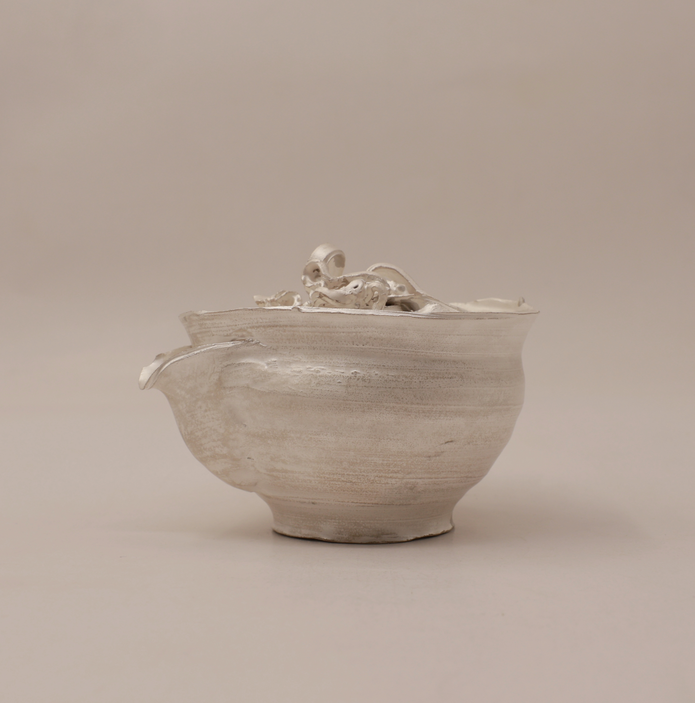 创作理念:黏土真的很神奇,因有水的加持,柔软似丝绸划过指尖,因有火的加持,又回归岩石般质地。创作者只有谦卑地顺应泥性,才能通过土的语言来表达。本次宝瓶的创作手法纯粹,只拉坯不修坯,尽可能保留创作痕迹而一气呵成。捉手是拉坯过程中的边角料率意堆砌,瓶身椭圆壶口向内边稍倾,看似随意的手法又尽量满足实用需求,盈盈一握,出汤利索,烤银后的金属质感又增添了一份现代气息,与写意的创作手法相得益彰,是创作者内心的一次浪漫之旅。