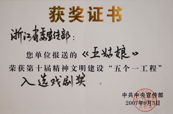 原创音乐剧《五姑娘》参演第七届中国艺术节,获第十一届“文华大奖”和第十届精神文明建设“五个一工程”奖。