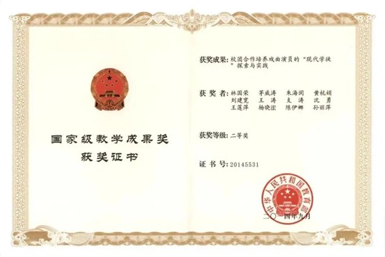 2014年,《校团合作培养戏曲演员的“现代学徒制”探索与实践》获国家级教学成果二等奖。