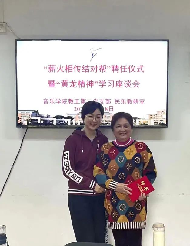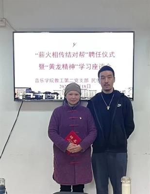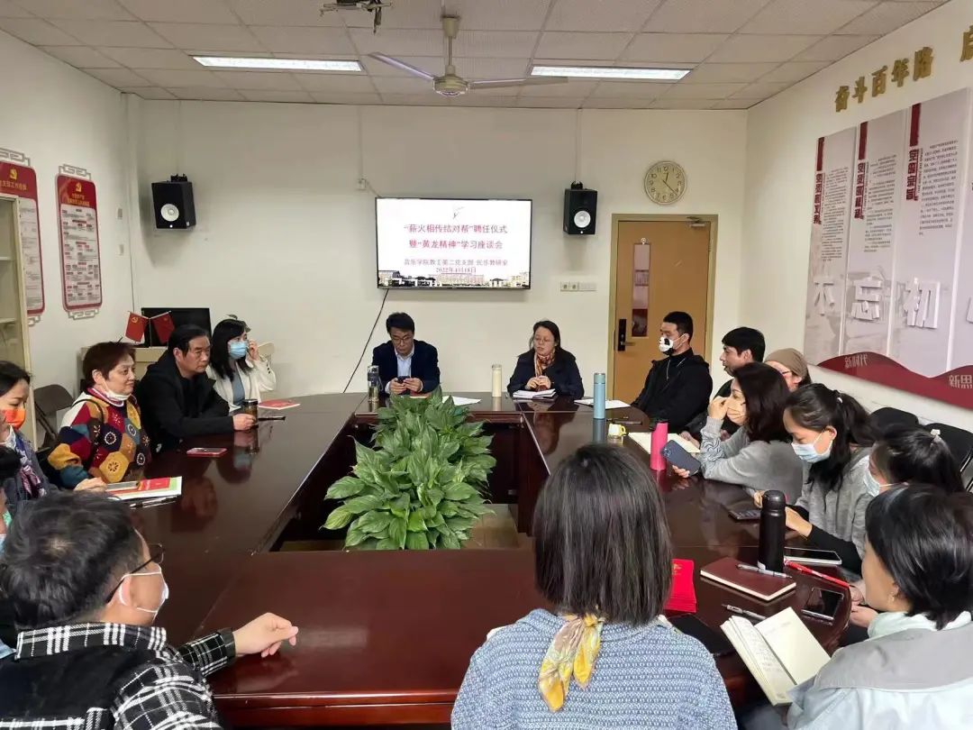 4月18日,音乐学院教工第二党支部、民乐教研室在3101党员之家举行“薪火相传结对帮”聘任仪式暨“黄龙精神”交流分享。吴樟华、朱学富、陆曙鸣、马崊等4位正高职称党员教师受聘结对4名青年教师,并作“黄龙精神”与教书育人心得分享。支部党员、民乐教研室全体教师参加。