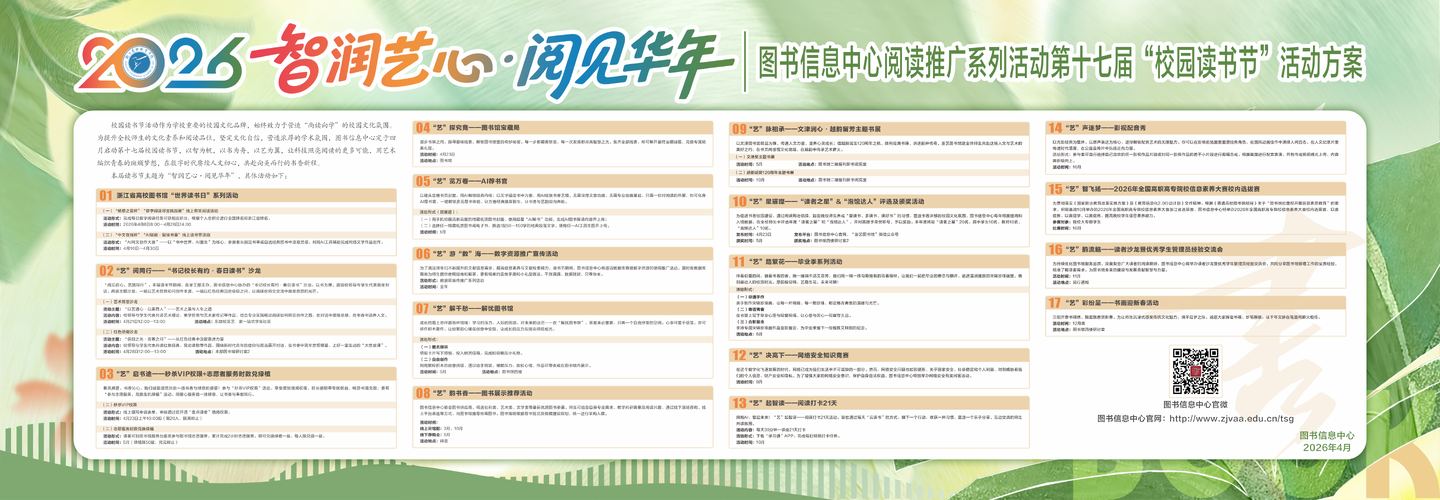 <!DOCTYPE html> <html> <head> </head> <body> <p style="text-indent: 24pt; line-height: 1.5; margin: 0cm; text-align: justify; font-size: 10.5pt; font-family: Calibri, sans-serif;"><span style="font-size: 16px; line-height: 150%; font-family: 宋体;">校园读书节活动作为学校重要的校园文化品牌,始终致力于营造&ldquo;尚读向学&rdquo;的校园文化氛围。为提升全校师生的文化素养和阅读品位,坚定文化自信,营造浓厚的学术氛围,</span><span style="font-family: 宋体; font-size: 16px;">第十七届校园读书节</span><span style="font-family: 宋体; font-size: 16px; text-indent: 24pt;">以&ldquo;智润艺心&middot;阅见华年&rdquo;</span><span style="font-family: 宋体; font-size: 16px; text-indent: 24pt;"> 为主题,以智为帆,以书为舟,以艺为翼,让科技照亮阅读的更多可能,用艺术编织青春的斑斓梦想,在数字时代赓续人文初心,共赴向美而行的书香新程。</span></p> <p style="text-indent: 24pt; line-height: 1.5; margin: 0cm; text-align: justify; font-size: 10.5pt; font-family: Calibri, sans-serif;"><span style="font-size: 16px;"><strong><span style="line-height: 150%; font-family: 宋体;">一、浙江省高校图书馆&ldquo;世界读书日&rdquo;系列活动</span></strong></span></p> <p style="text-indent: 24pt; line-height: 1.5; margin: 0cm; text-align: justify; font-size: 10.5pt; font-family: Calibri, sans-serif;"><span style="font-size: 16px; line-height: 150%; font-family: 宋体;">(一)&ldquo;畅想之星杯&rdquo;&ldquo;数字阅读寻宝挑战赛&rdquo;线上有奖阅读活动</span></p> <p style="text-indent: 24pt; line-height: 1.5; margin: 0cm; text-align: justify; font-size: 10.5pt; font-family: Calibri, sans-serif;"><span style="font-size: 16px; line-height: 150%; font-family: 宋体;">活动形式:完成每日数字阅读任务可获相应积分,根据个人总积分进行全国排名和浙江省排名。</span></p> <p style="text-indent: 24pt; line-height: 1.5; margin: 0cm; text-align: justify; font-size: 10.5pt; font-family: Calibri, sans-serif;"><span style="font-size: 16px;"><span style="line-height: 150%; font-family: 宋体;">活动时间:</span><span style="line-height: 150%; font-family: 宋体;">2026</span><span style="line-height: 150%; font-family: 宋体;">年4月8日8:00&mdash;4月28日24:00</span></span></p> <p style="text-indent: 24pt; line-height: 1.5; margin: 0cm; text-align: justify; font-size: 10.5pt; font-family: Calibri, sans-serif;"><span style="font-size: 16px;"><span style="line-height: 150%; font-family: 宋体;">(二)&ldquo;中文在线杯&rdquo;&ldquo;</span><span style="line-height: 150%; font-family: 宋体;">AI</span><span style="line-height: 150%; font-family: 宋体;">赋能&middot;智绘书香&rdquo;线上读书节活动</span></span></p> <p style="text-indent: 24pt; line-height: 1.5; margin: 0cm; text-align: justify; font-size: 10.5pt; font-family: Calibri, sans-serif;"><span style="font-size: 16px;"><span style="line-height: 150%; font-family: 宋体;">活动形式:&ldquo;</span><span style="line-height: 150%; font-family: 宋体;">AI</span><span style="line-height: 150%; font-family: 宋体;">网文创作大赛&rdquo;&mdash;&mdash;以&ldquo;书中世界,</span><span style="line-height: 150%; font-family: 宋体;">AI</span><span style="line-height: 150%; font-family: 宋体;">重生&rdquo;为核心,参赛者从指定书单或自选经典图书中汲取灵感,利用</span><span style="line-height: 150%; font-family: 宋体;">AI</span><span style="line-height: 150%; font-family: 宋体;">工具辅助完成网络文学作品创作。</span></span></p> <p style="text-indent: 24pt; line-height: 1.5; margin: 0cm; text-align: justify; font-size: 10.5pt; font-family: Calibri, sans-serif;"><span style="font-size: 16px;"><span style="line-height: 150%; font-family: 宋体;">活动时间:</span><span style="line-height: 150%; font-family: 宋体;">4</span><span style="line-height: 150%; font-family: 宋体;">月10日&mdash;4月30日</span></span></p> <p style="text-indent: 24pt; line-height: 1.5; margin: 0cm; text-align: justify; font-size: 10.5pt; font-family: Calibri, sans-serif;"><span style="font-size: 16px;"><strong><span style="line-height: 150%; font-family: 宋体;">二、&ldquo;艺&rdquo;阅同行&mdash;&mdash;&ldquo;书记校长有约&middot;春日读书&rdquo;沙龙</span></strong></span></p> <p style="text-align: left; text-indent: 24pt; line-height: 1.5; margin: 0cm; font-size: 10.5pt; font-family: Calibri, sans-serif;" align="left"><span style="font-size: 16px; line-height: 150%; font-family: 宋体;">&ldquo;阅见初心,艺路同行&rdquo;。本届读书节期间,由学工部主办、图书信息中心协办的&ldquo;书记校长有约&middot;春日读书&rdquo;沙龙,以书为媒,邀请校领导与学生代表围坐对话。两场主题沙龙,一场以艺术哲思叩问创作本源,一场以红色经典回应信仰之问,让阅读在师生交流中焕发思想的光芒。</span></p> <p style="text-indent: 24pt; line-height: 1.5; margin: 0cm; text-align: justify; font-size: 10.5pt; font-family: Calibri, sans-serif;"><span style="font-size: 16px; line-height: 150%; font-family: 宋体;">(一)艺术哲思沙龙</span></p> <p style="text-indent: 24.1pt; line-height: 1.5; margin: 0cm; text-align: justify; font-size: 10.5pt; font-family: Calibri, sans-serif;"><span style="font-size: 16px; line-height: 150%; font-family: 宋体;">活动主题:&ldquo;以艺通心&middot;以美育人&rdquo;&mdash;&mdash;艺术之美与人生之道</span></p> <p style="text-align: left; text-indent: 24pt; line-height: 1.5; margin: 0cm; font-size: 10.5pt; font-family: Calibri, sans-serif;" align="left"><span style="font-size: 16px; line-height: 150%; font-family: 宋体;">活动内容:校领导与学生代表共读艺术理论、美学哲思与艺术家传记等作品,结合专业实践畅谈阅读如何照见创作之路,在对话中碰撞灵感,在书香中涵