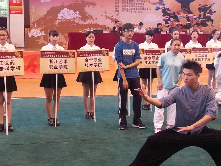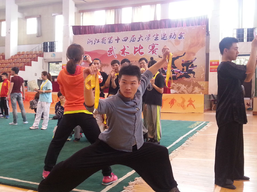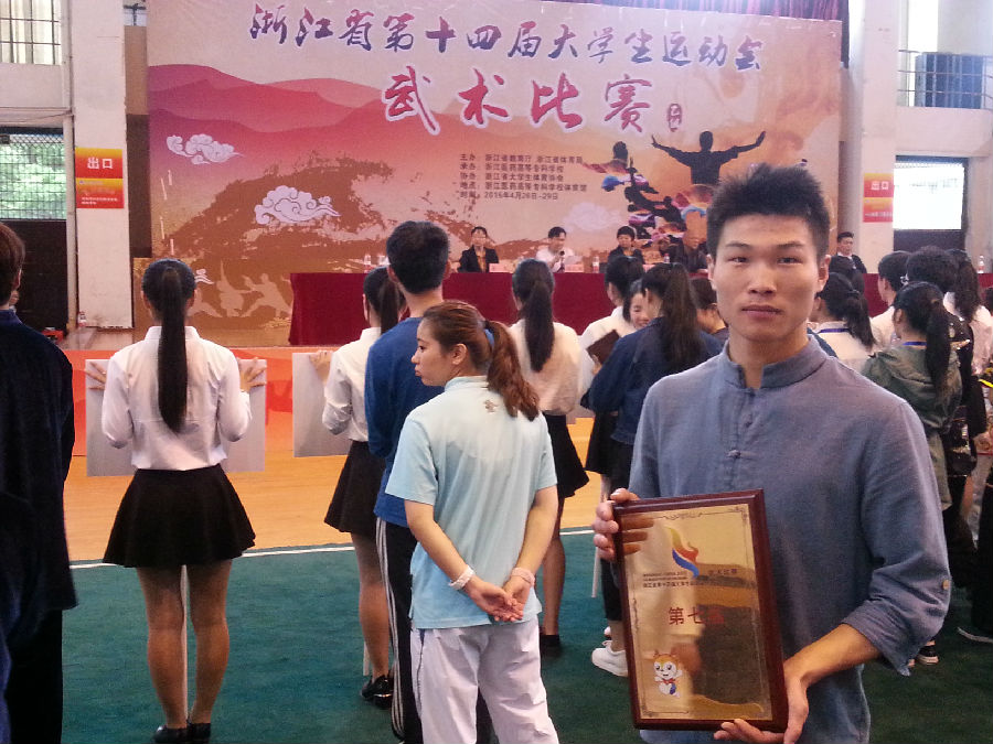 四年一届的浙江省第十四届大学生运动会武术比赛于2015年4月26-29日在浙江医药高等专科学校举行,经过层层选拔,我院选派了一位运动员参加了此次比赛,由黄文明老师担任领队、顾才铭老师担任教练。本次比赛有来自全省17所高职院校、100多名大学生运动健儿参加武术套路比赛的激烈角逐。我院舞蹈系13编导班刘乐同学参加了男子长拳和刀术两个项目,经过激励的角逐,刘乐同学获得了男子长拳第二名、男子刀术第三名的好成绩,同时我院代表队获得了男子团体第七名的好成绩,顾才铭老师获得了“优秀教练员”称号、刘乐同学获得“优秀运动员”称号。