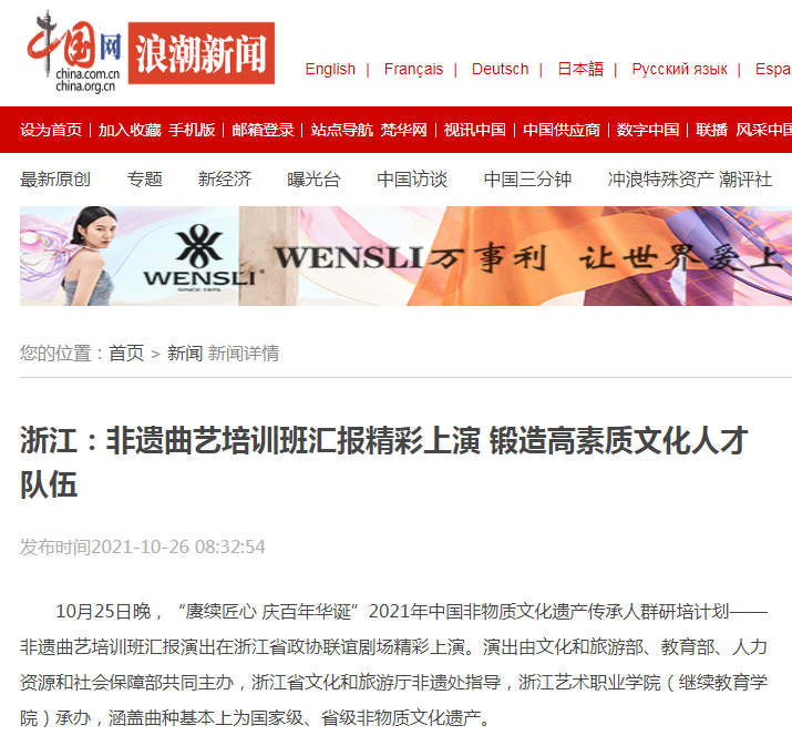 今年10月份,文化和旅游部、教育部、人力资源社会保障部多部委联合印发《中国非物质文化遗产传承人研修培训计划实施方案》(2021-2025),浙江艺术职业学院再一次作为浙江五所高校之一、浙江省唯一一所高职院校位列其中,这是对学校非遗研培工作的高度肯定和殷切期望。未来浙江艺术职业学院将继续发挥浙江艺术类高校的研培优势,聚焦新时代非遗曲艺传承人群的培养提升,提供持久的人才保障,激活非遗曲艺人才内生活力和发展动力。