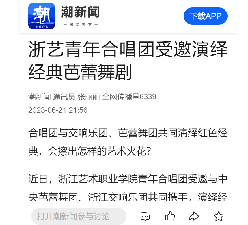 近日,浙江艺术职业学院青年合唱团受邀与中央芭蕾舞团、浙江交响乐团共同携手,演绎经典芭蕾舞剧《红色娘子军》。
