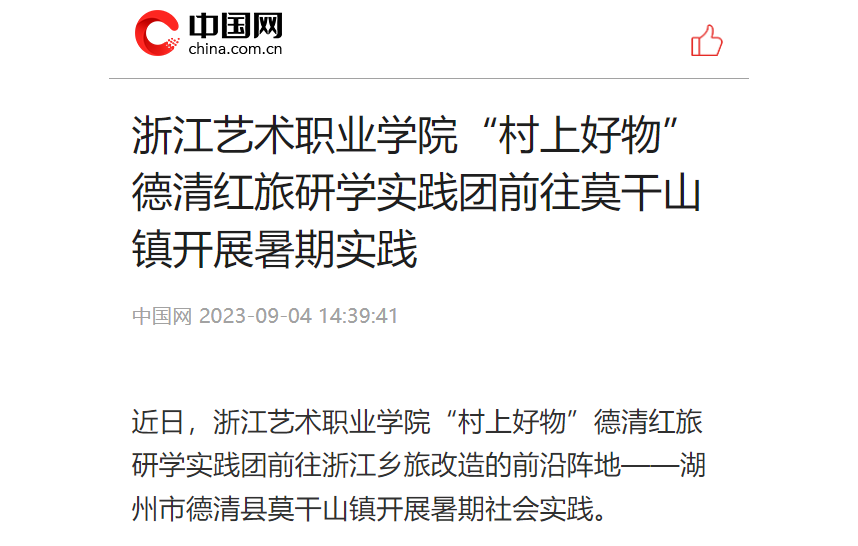 近日,浙江艺术职业学院“村上好物”德清红旅研学实践团前往浙江乡旅改造的前沿阵地——湖州市德清县莫干山镇开展暑期社会实践。