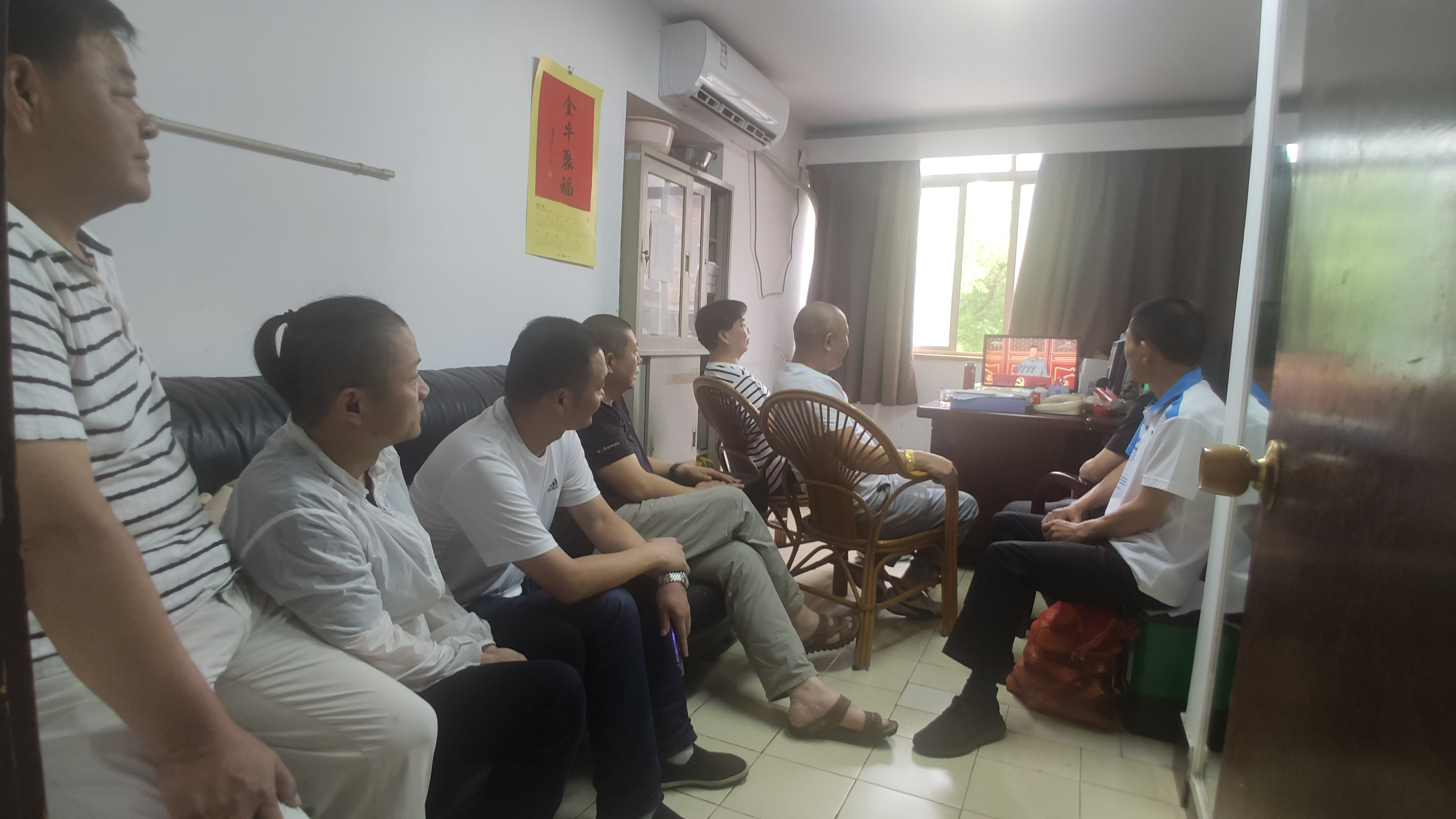 8点整,教职工们准时聚集在1108会议室,观看激动人心的历史时刻,另有工作安排的食堂师傅们、车队师傅们和值班医生们也在他们的岗位上用手机收看了此次直播。