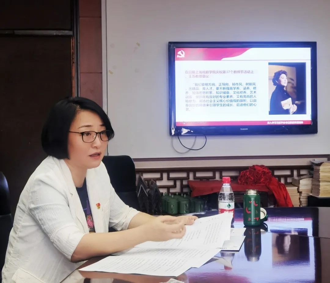 支涛以曾在浙艺任教的盖叫天、姚水娟等德高望重的老艺术家和现在依然引领着戏曲人前进的特聘教授汪世瑜、杨小青、茅威涛等为例,阐释了什么是“四有”好老师;她结合传统戏曲文化的现状和发展所面临的挑战,从“产、教、演、研、联”5个角度分析了戏曲艺术要承担的历史文化重任和塑形铸魂赋能的重要作用,从而引申出做“四有”好老师对坚定文化自信、弘扬优良传统、坚持守正创新的重要意义,以及老师们作为传道者、引路人、筑梦人的重要职责。她讲到,做一个好老师,关键要有把教书育人当作毕生事业的情怀,要时刻想到新生在行拜师礼时的“三拜”和教师节的一句“老师,您辛苦了”所带给我们热泪盈眶式的感动,要想到学生在艺术的天空放飞梦想时带给我们的欣慰。