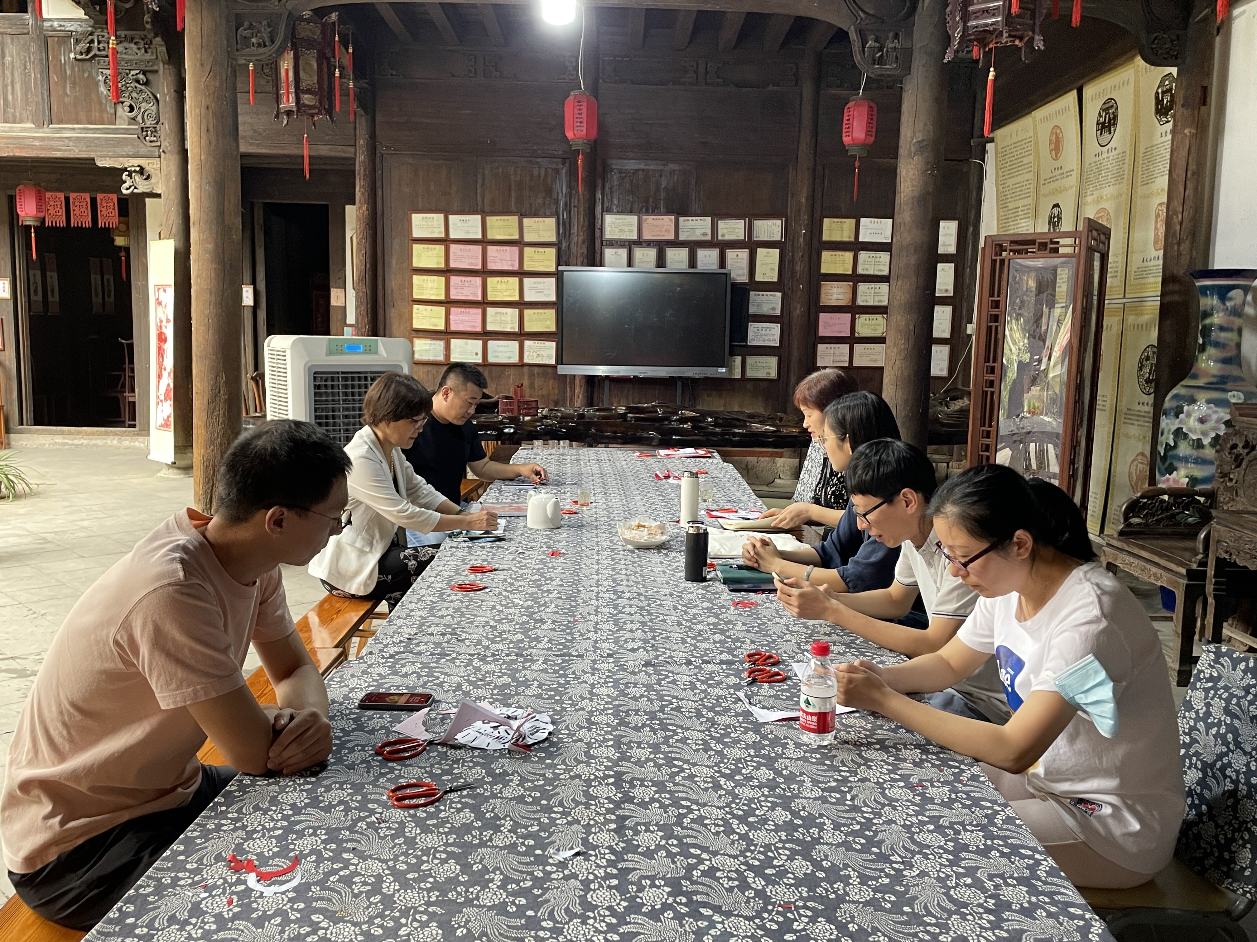 金华市剪纸博物馆是由高级工艺美术师、浙江省级工艺美术大师、省级非遗“金华剪纸”传承人詹东明创办。自2011年成立以来,一直坚持免费向公众开放,积极履行社会责任,以展示、宣传、研究、保护与传承剪纸非遗为立馆宗旨。馆藏有詹东明先生的3500多件作品,以其体量之大、题材之广泛而著称。在交流过程中,馆方向我们介绍了民间非遗传承之路的真实现状,也讲述了目前非遗传承所面临的人才匮乏、支撑不强等发展困境,双方也就未来的学生实践、展览交流等事项达成了初步合作意向。