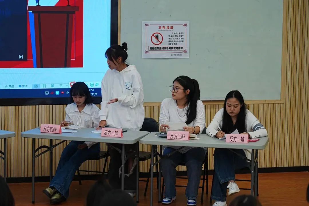 在激烈的辩论过程中,双方分秒必争,在有限的时间里提出有力论点、陈述具体论据,并对对方论点提出质疑。