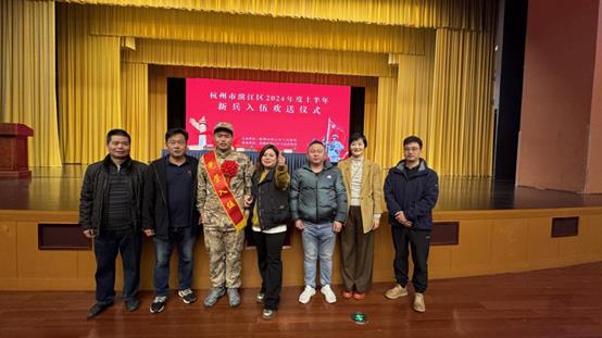 莘莘学子携笔从戎,参军报国建功立业。3月15日,杭州市滨江区2024年度上半年新兵入伍欢送仪式在区文化中心二层大礼堂举行。设计学院2021级服装与服饰设计班学生吴浩东经过体检、政考、审批定兵等环节选拔光荣入伍。设计学院党总支副书记汪仕龙,班主任王艺璇,保卫处干事茹叶辉参加仪式。