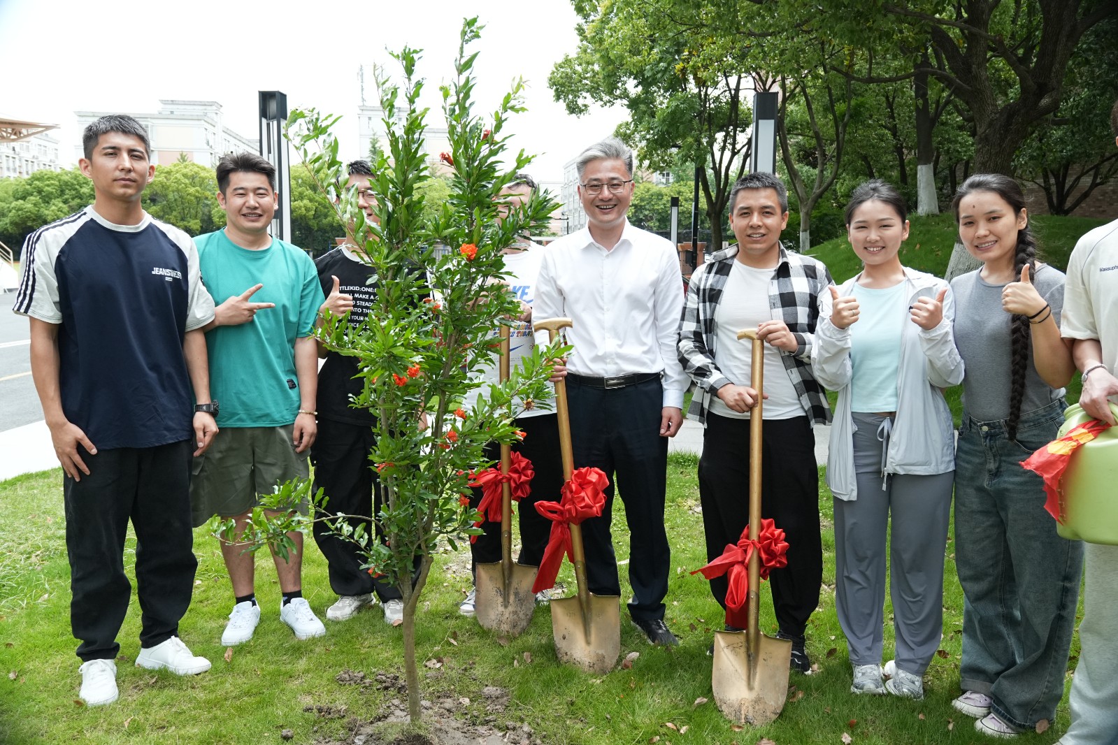 活动最后,在报告厅门口的民族林种植区,老师与同学们一同挥锹铲土、浇水灌溉,种下一株株象征团结石榴树。培土时的专注,浇水时的期待,同学们每一个动作都饱含着对未来的憧憬。石榴树苗扎根沃土,正如浙疆情谊在交流中不断生长、愈发深厚它象征着各民族像石榴籽一样紧紧相拥的团结精神,也寓意着 “我爱浙疆・基层文化员” 项目在边疆播撒的文化种子,终将长成枝繁叶茂的大树。这场温暖的相聚,不仅是浙疆两地文化交融的生动写照,更让每位学员将 “扎根边疆、服务基层” 的信念深植于心。相信在未来,他们定能带着母校的祝福与期望,在文化润疆的道路上绽放出更加绚烂的光彩,让浙疆同心的石榴花开遍边疆大地。
