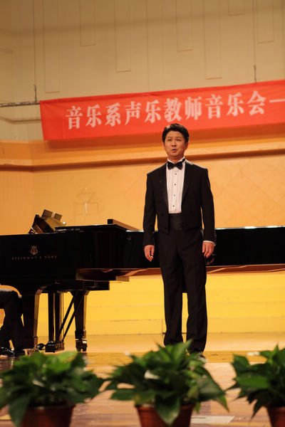 音乐会由声乐教研室主任谢志勇主持。这位曾经为我院培养出众多优秀歌唱人才的青年教师,在多年的教学工作中业绩突出,由他指导的学生前不久刚荣获全国高等职业院校技能大赛艺术专业赛项声乐表演类高职组二等奖,为学院赢得了荣誉。他是第一位登台表演的老师。伴随着出色的艺术指导吕烁老师典雅的钢琴声奏起,谢志勇抒情男高音的温暖音质尽显无疑。他演唱的咏叹调《我的灵魂——选自歌剧<费罗里坦德>》与艺术歌曲《哦,我可爱的亲人》,将观众带入了诗情画意的巴洛克、浪漫主义时期。紧接着上台表演的李海涓、孔海舟是两位年轻教师,他们的演唱代表了音乐系新一代青年声乐教师的风貌。随后悉数登台献唱的老师们,每一位都是有着丰富教学经验的名师:于善英、杨晓亮、刘琼、潘冠泽、黄琦、郭义江。他们中的每一位亮相,都给在场观众带去不小的惊喜。于善英一袭高贵的蓝色礼服,一出场便吸引了观众的眼球,她的演唱亦如一杯香醇的红酒,细细品味,甘甜留于心间。杨晓亮用透亮的男高音,如泣如诉地演唱了《妮娜》和《虽然你冷酷无情》这两首悲情的艺术歌曲。刘琼身着斜肩晚礼服,让学生们领略了平日里严肃的老师高雅端庄的另一面,她声情并茂的演唱更是打动了每位观众的心。潘冠泽曾留学俄罗斯,华丽的海派唱腔将《我亲爱的》《多么幸福能赞美你》诠释得淋漓尽致。黄琦是音乐会的闪亮之星,灰黑色的千层宝塔裙礼服,时尚又不失端庄,她的歌声总是那么地饱含深情,让人听了如此感动。压轴献演的郭义江尽管身兼领导职责公务繁忙,但依然以充沛的热情为观众带来了《绿树成荫》《重归苏莲托》两首脍炙人口的著名男高音歌剧唱段,将晚会气氛推向高潮。