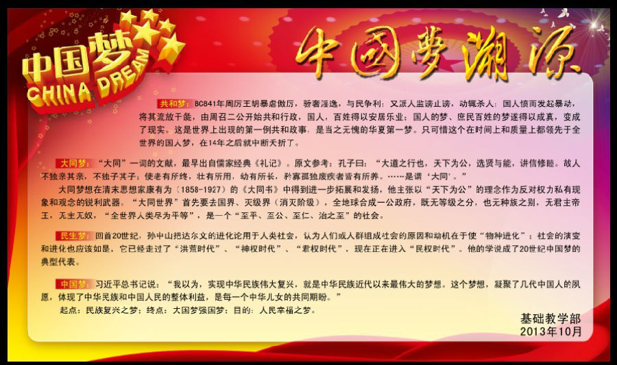 为深入学习贯彻党的十八大精神,引导全院广大学生为实现国家富强、民族复兴、人民幸福的伟大“中国梦”而勤奋学习、立志成才、积极进取,根据浙江艺术职业学院《关于深入开展“我的中国梦”主题教育活动的通知》精神,组织全院各教学单位开展“中国梦”主题教育宣传栏比赛。经过一个月的精心策划、制作,各教学系部策划制作出各具特色的“中国梦”主题宣传栏,有的反映各系教学风采和学风精神,有的反映师生对于“中国梦”的向往,有的对“中国梦”进行溯源,等等,参评作品有着较高的质量,令人耳目一新。