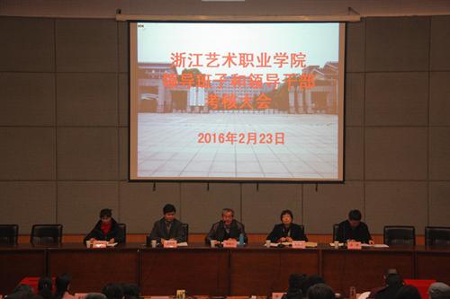 2月23日上午,浙江艺术职业学院在学院图书信息中心报告厅召开学院领导班子及领导干部考核大会。省文化厅党组成员、副厅长杨越光、省委宣传部干部处主任科员金鑫、省文化厅人事处调研员杜毓英,学院党政领导班子成员、中层处级干部、副高以上职称人员、民主党派负责人、教代会、职代会执委会成员、近三年退休的院领导等参加会议。会议由院党委书记朱海闵主持。