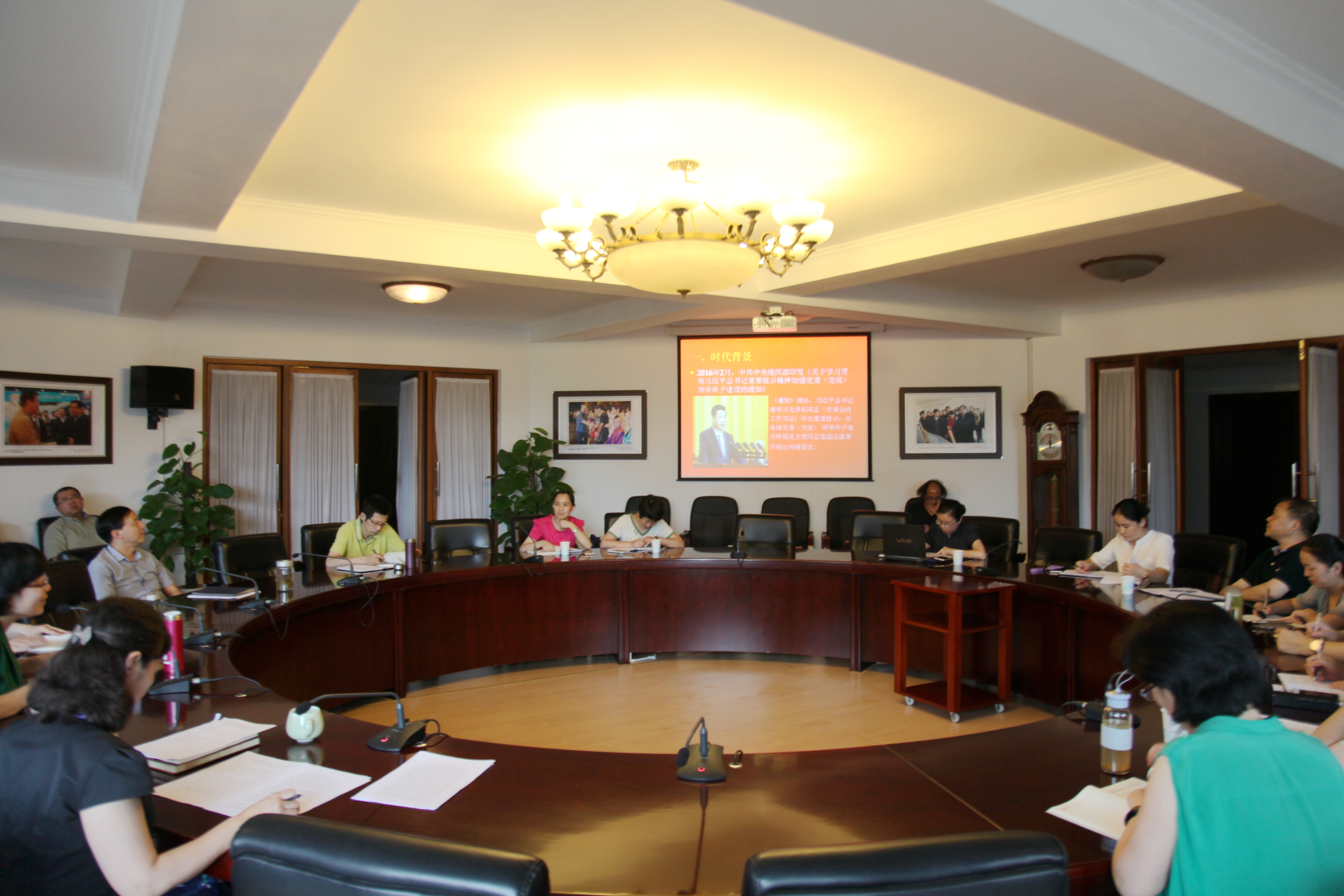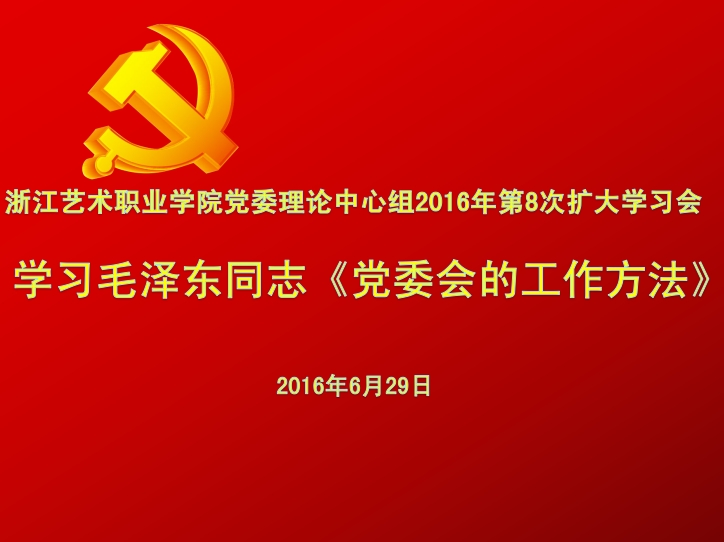 6月29日下午,浙江艺术职业学院党委理论中心组召开2016年第8次扩大学习会,重温毛泽东同志《党委会的工作方法》,深入学习贯彻习近平总书记关于“学习毛泽东同志《党委会的工作方法》,加强党委(党组)领导班子建设”的重要批示精神。院党委班子成员、副处以上中层干部参加会议。学院党委书记朱海闵主持会议。院长、党委副书记黄杭娟的从时代背景、主要内容、基本思想和重要意义等方面作了导读。