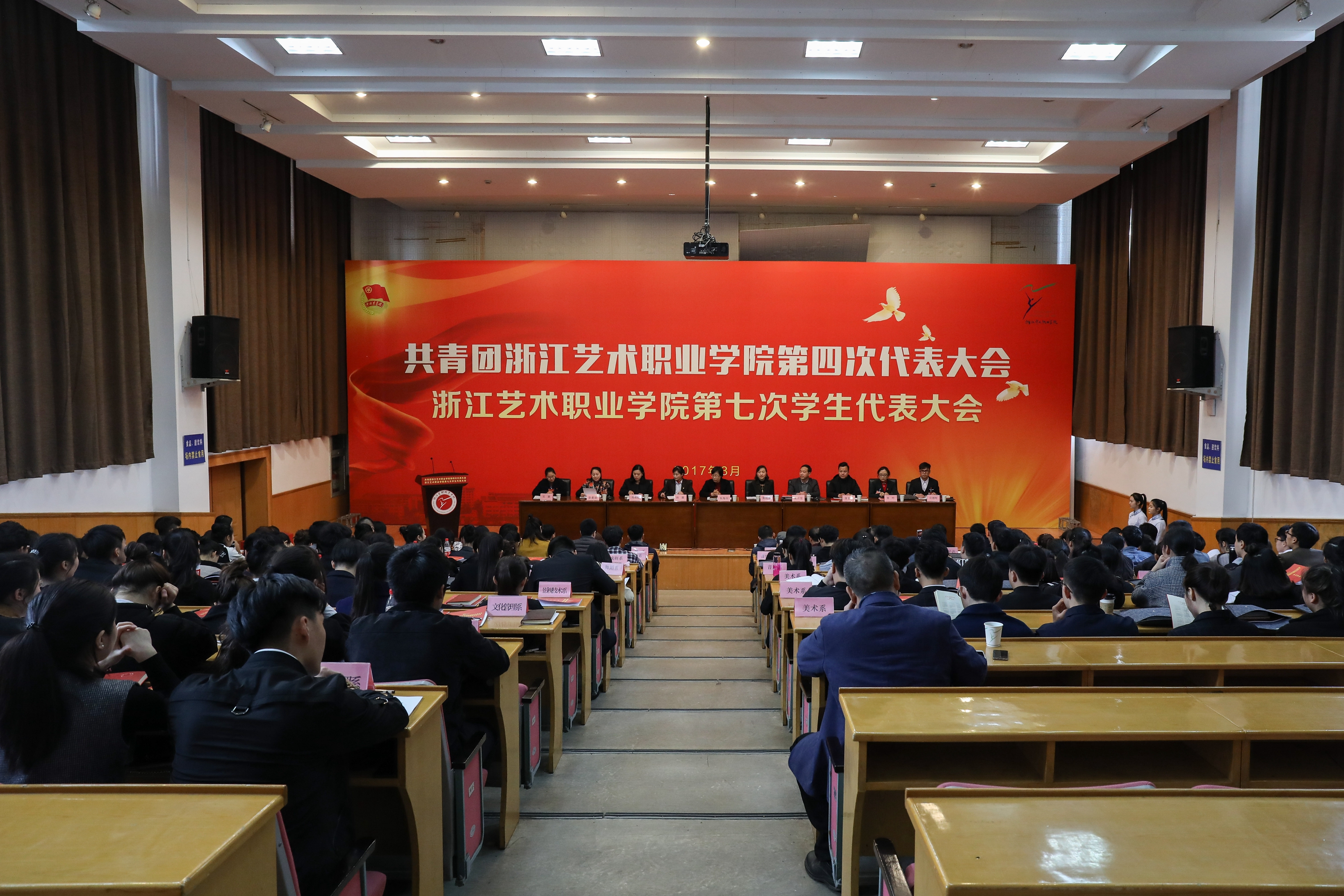 院党委书记朱海闵、院长黄杭娟,院党委委员、副院长夏开堂出席开幕式,省直机关团工委书记韩璐、省文化厅机关团委书记周朝虹与会。浙江建设职业技术学院团委书记、共青团浙江省高职高专联席会主席张加涨及滨江区团区委、浙江中医药大学、杭州医学院、浙江警察学院、浙江机电职业技术学院、浙江商业职业技术学院等兄弟院校团委负责人到会祝贺。学院党委职能部门负责人、教学单位党政负责人应邀列席会议。来自全院7个基层团总支的145名团学代表参加会议。