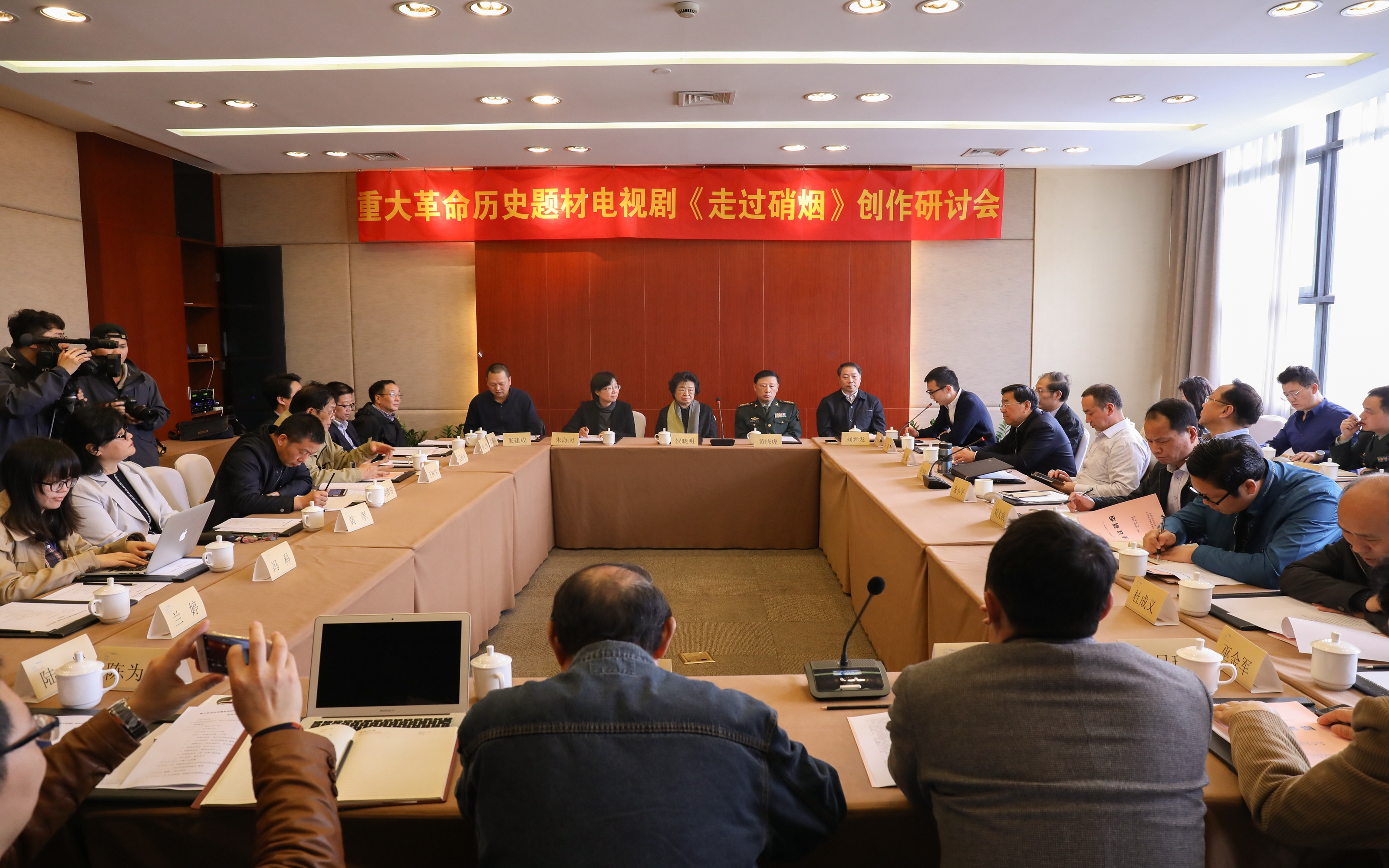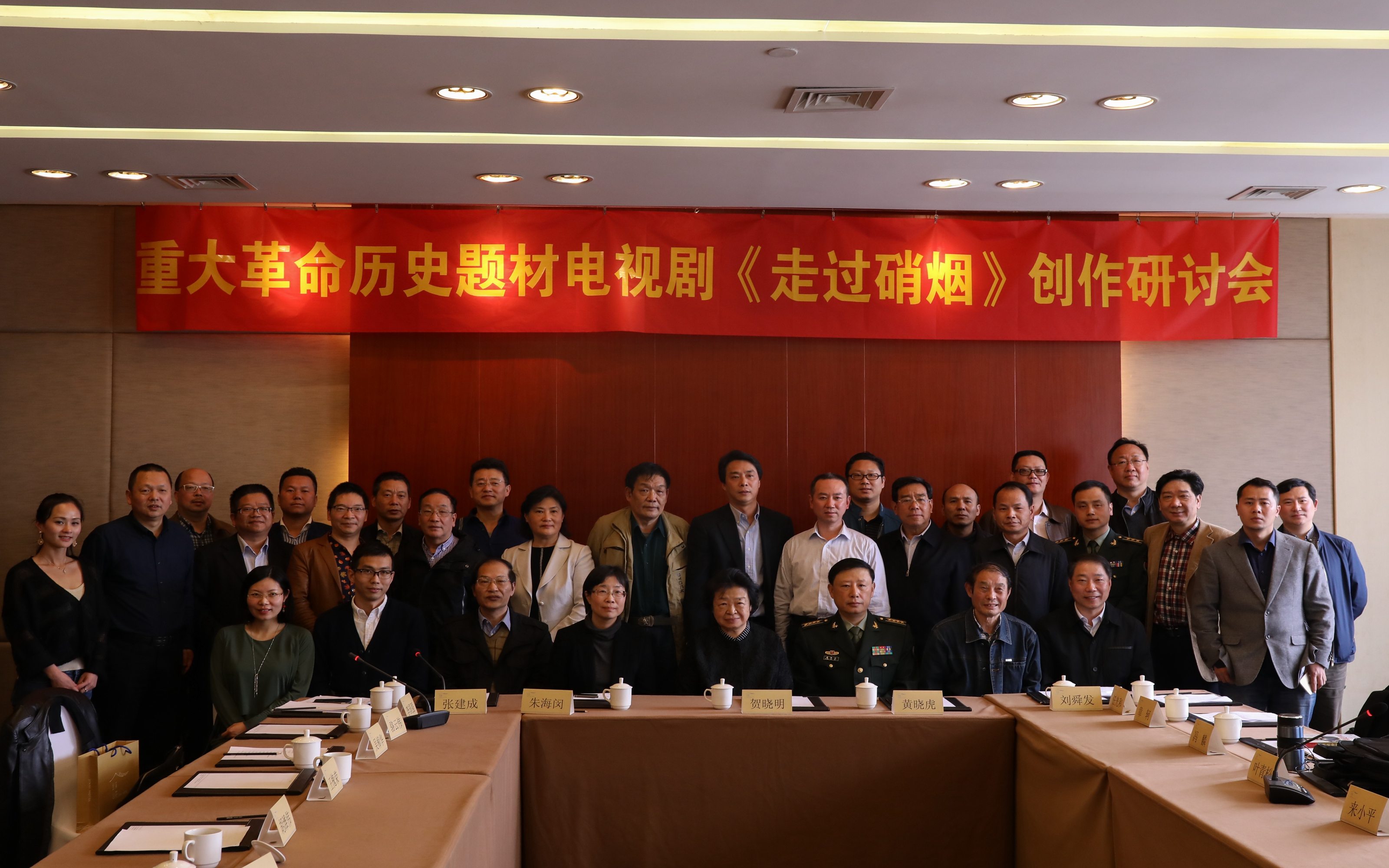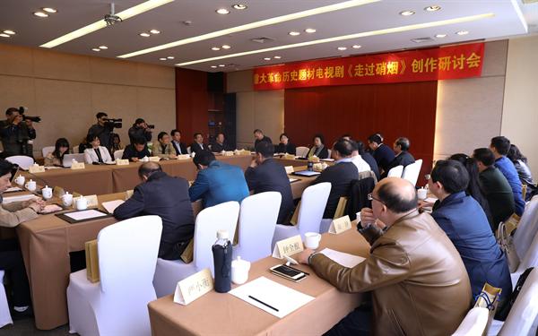 朱海闵在研讨会上致词。她说,《走过硝烟》是一部有英雄气质的电视剧。战火连天戎马倥偬的时代尽管已远去,但我们将它拉回视野,重捡起那些历史细节,革命前辈坚定崇高理想信念,为了国家和人民,用英勇斗争的革命精神和刚烈无畏的行动争取胜利,依然震撼着我们。今年是中国人民解放军建军90周年,我们创作这部电视剧,对回望历史不忘初心有着时代价值和意义。习近平总书记在中国文联十大、中国作协九大开幕上强调,歌唱祖国、礼赞英雄从来都是文艺创作的永恒主题,也是最动人的篇章。我院影视创作水平不断提高,原创电影在国内外影展中屡屡获奖,为更好地与产业接轨,也为我院相关专业师生搭建一个实践的平台,本次创作通过多元方式,联合社会优势创作力量,希望打造出一部有担当有社会责任感的影视精品。