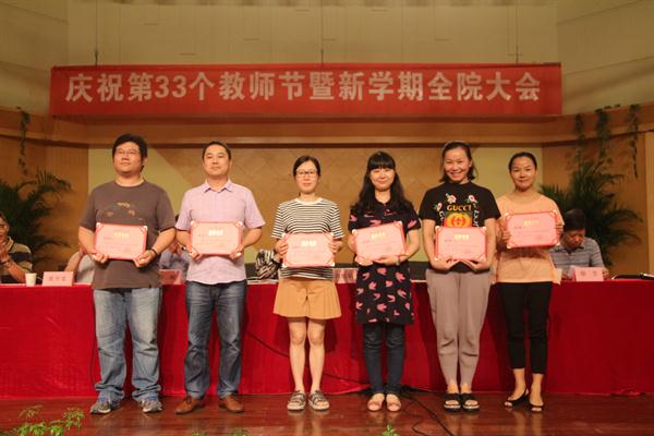 党委委员、副院长夏开堂宣读2016年度院级先进集体和个人(含优秀干部、优秀教师、优秀教育工作者)、院级先进党组织和优秀共产党员、厅级以上优秀团队和人才称号、挂职锻炼人员年度考核优秀人员表彰名单,党委委员、副院长沈恒宣读2016-2017年度学院在各类重大赛事中的获奖表彰名单。院领导为获奖集体和个人颁发奖证奖牌。
