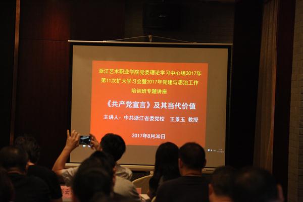 8月30日,浙江艺术职业学院党委理论学习中心组2017年第11次扩大学习会暨党建与思政教育工作培训班特邀浙江省委党校政治学教研部王景玉教授作《<共产党宣言>及其当代价值》专题讲座。党委书记朱海闵主持,院党委班子成员、处科级干部、思政理论课教师、党建与思政教育工作者等120余人聆听讲座。