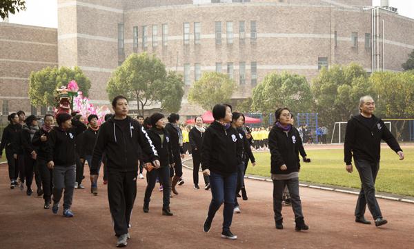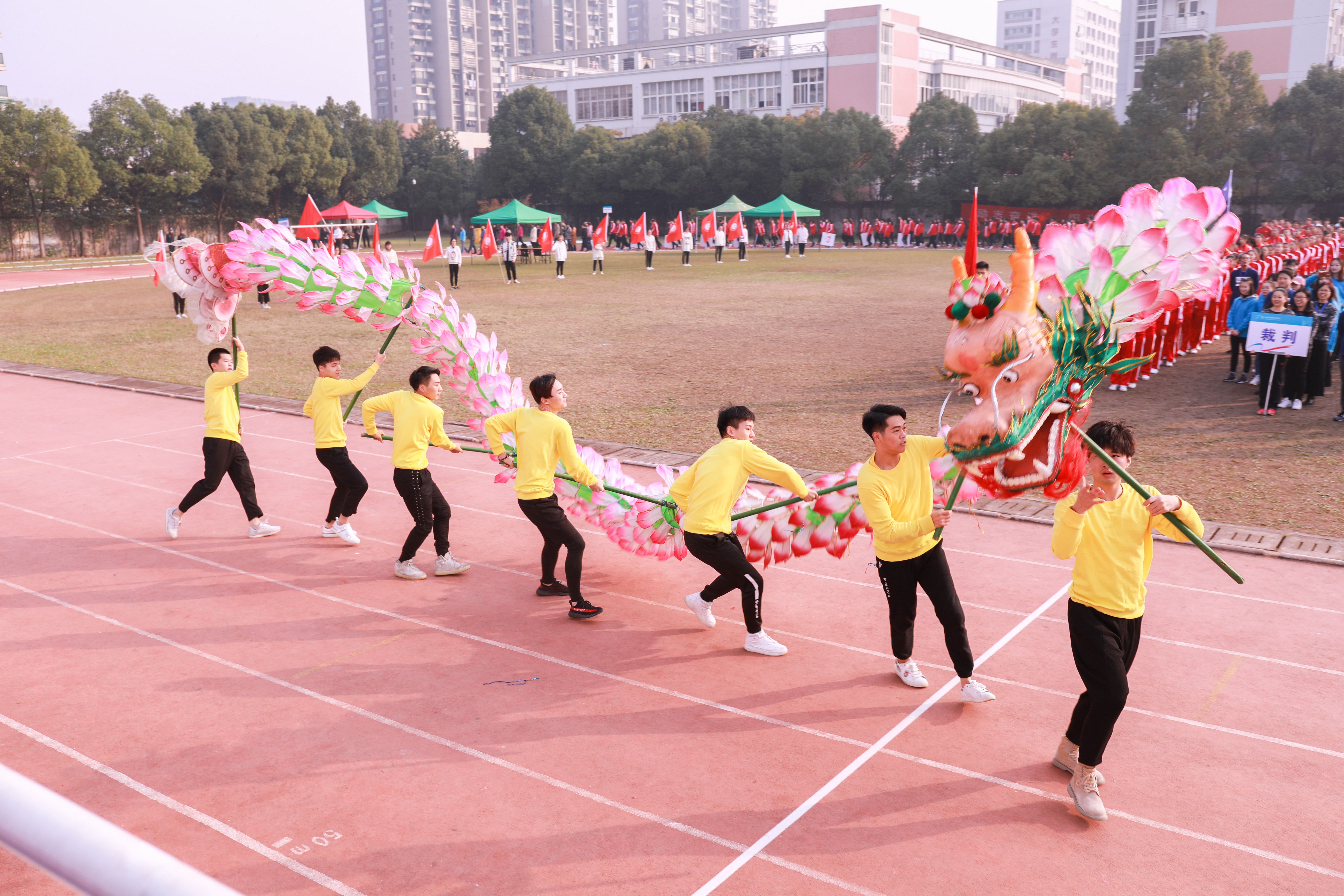 难得的艳阳天仿佛是为了迎接这场运动会。绿荫操场上,每一位师生都精神饱满,脸上洋溢着灿烂的笑容。经过充分的准备,各代表团运动员们在本系老师们的带领下以昂扬的姿态迈着整齐有力的步伐走入田径场。这群如阳光般炽热的青年,焕发着青春的光彩和力量。六个系的入场式可谓“六仙过海”各显“神通”。比如美术系的老师们身披对披,羽化飘逸,是由美术系服装专业师生们共同设计制成,别具特色。戏剧系同学以舞龙表演的方式入场,在阳光的映衬下很是耀眼。