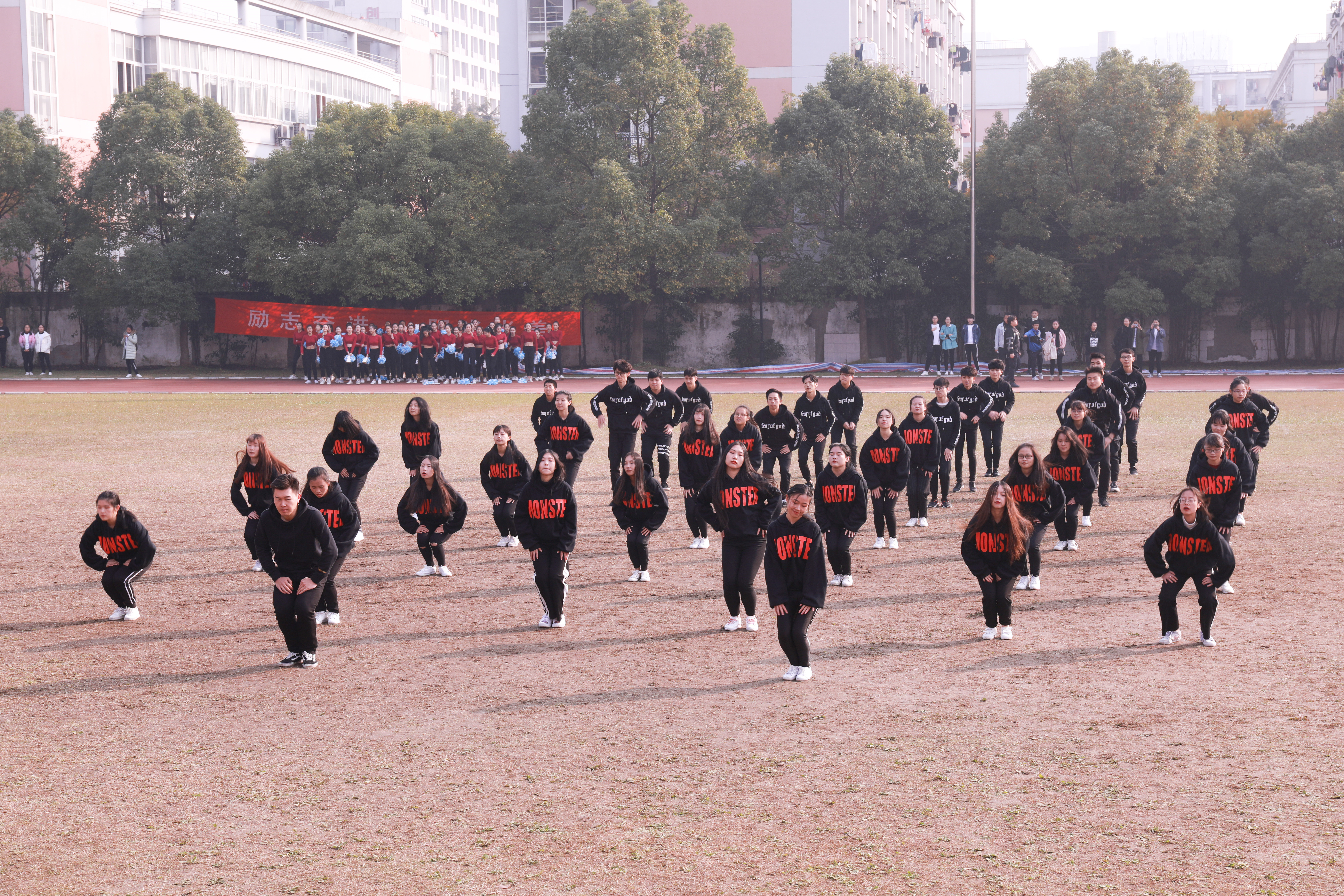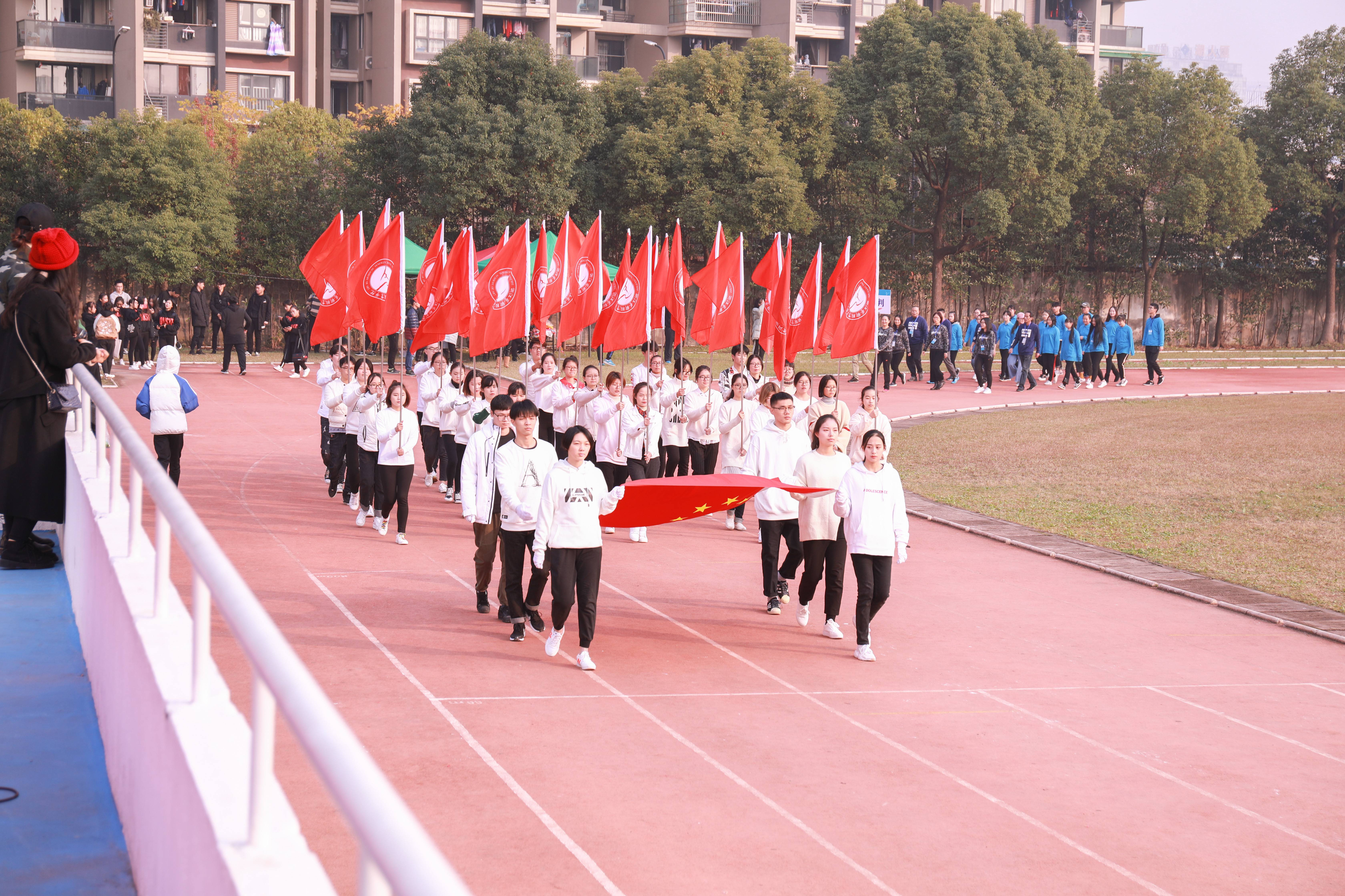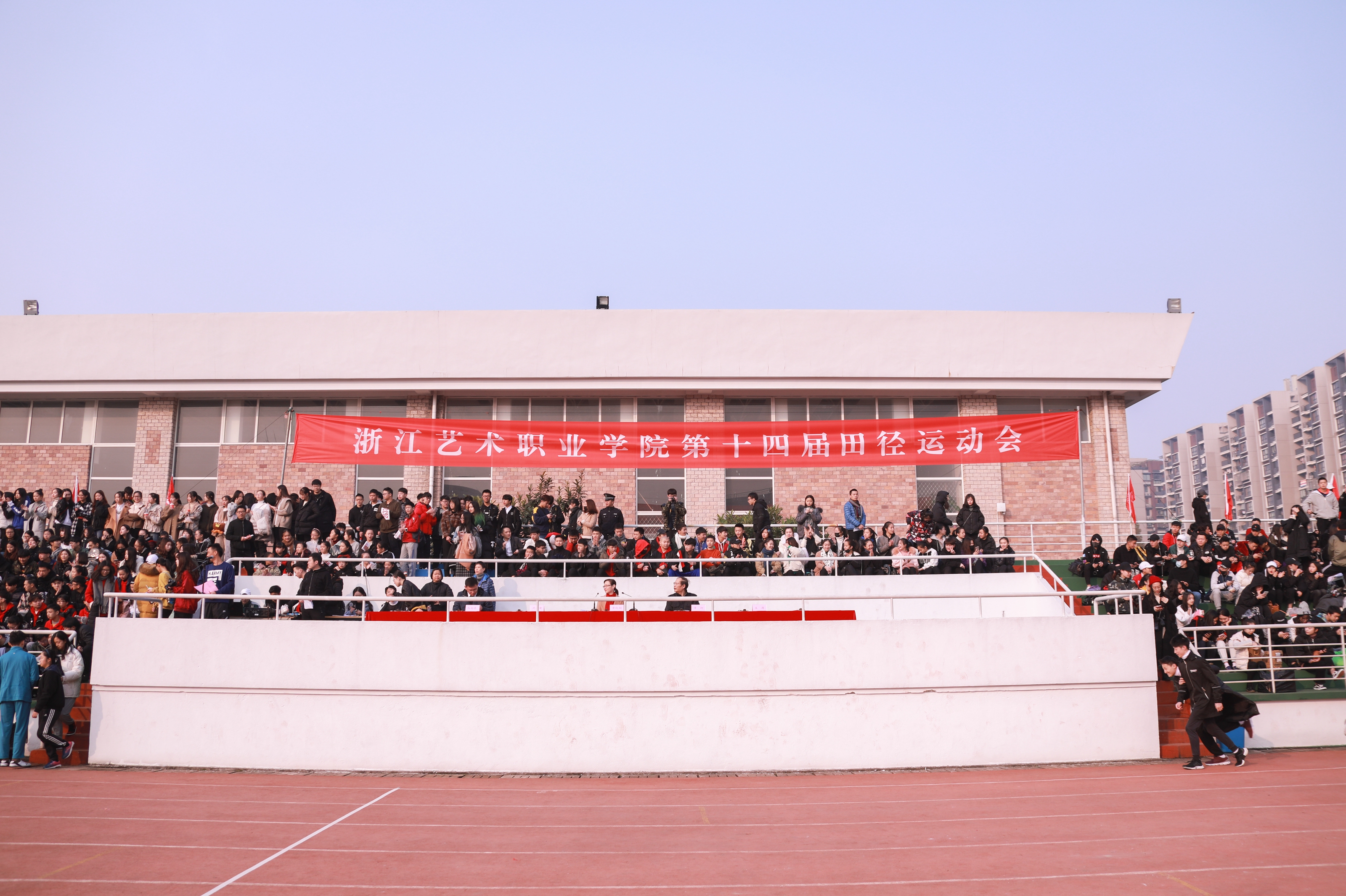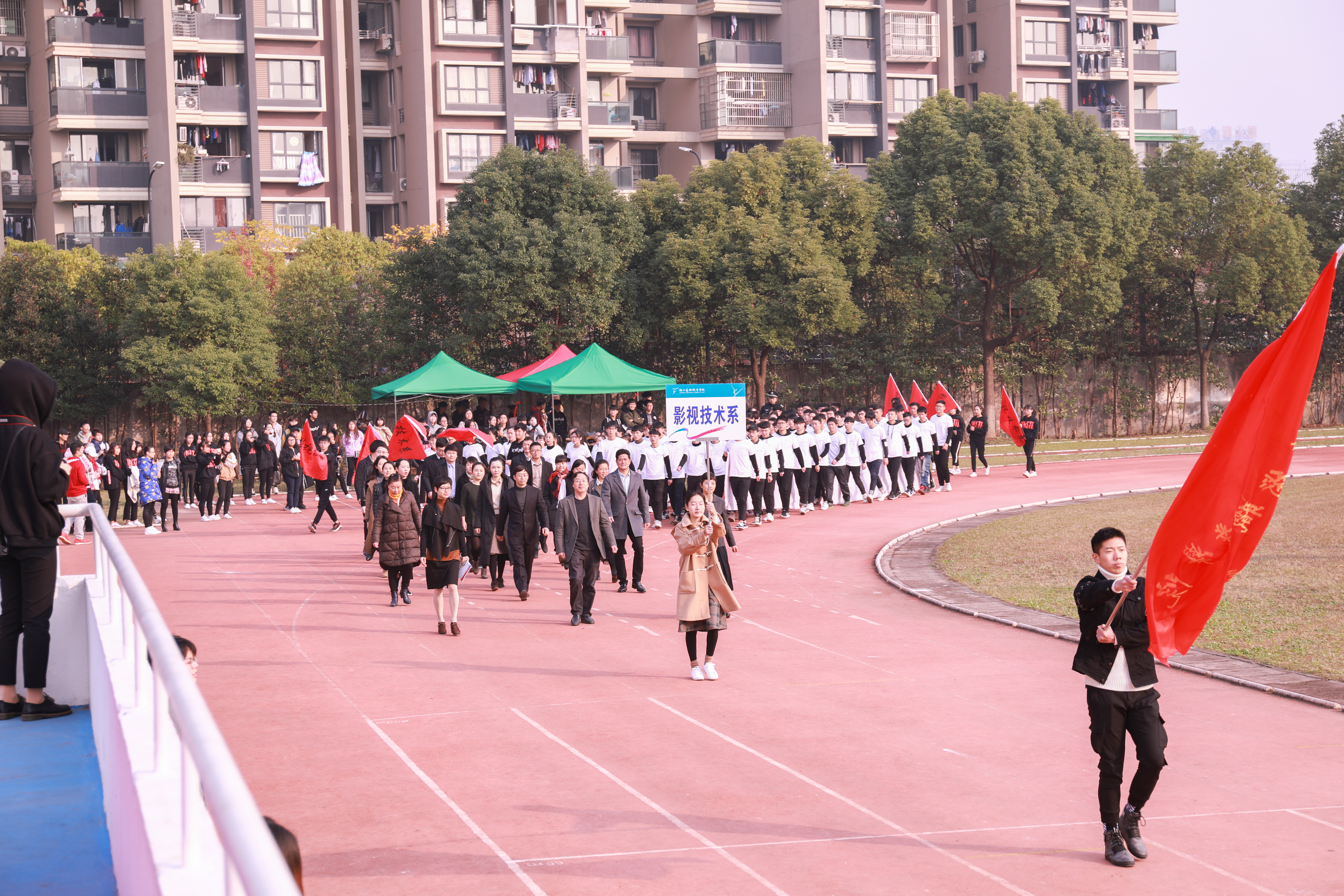 开幕式上进行了广播操和团体操的比赛。广播操比赛中,同学们用整齐规范,有力到位的动作展现了浙艺学子积极进取的精神风貌。团体操的比赛堪称精彩绝伦,各系学子精心准备,结合专业发挥了各自的特长,有舞蹈,有RAP,展现了艺术与体育的糅合之美和综合类艺术院校学子的多才多艺。同学们的激情,温暖了这个冬日。相信即使在若干年后,浙艺田径场上的每一幕都是值得回忆的青春。
