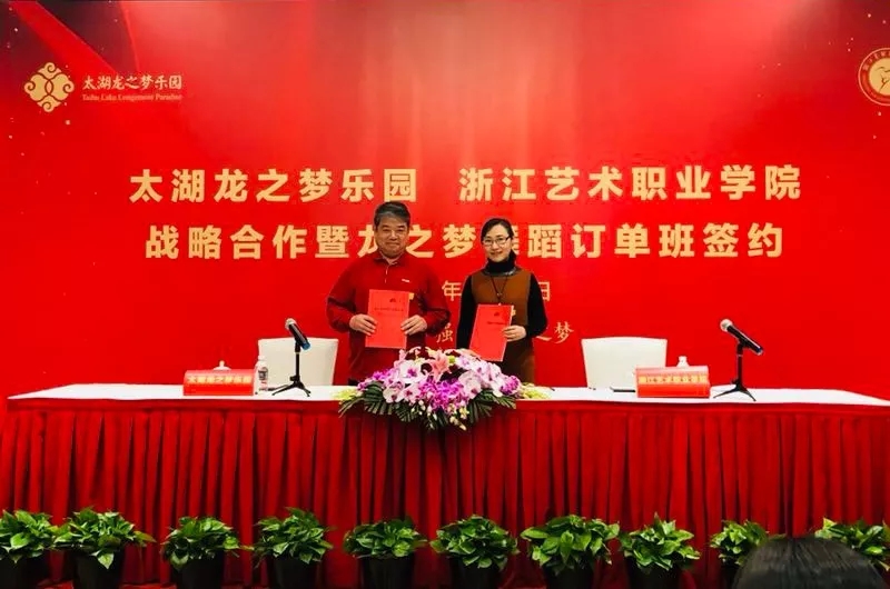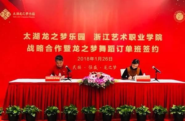 浙江艺术职业学院是浙江省优秀的全日制综合性高等艺术院校,建校60余年间,为社会培养了万余名各类文化艺术人才,其中不乏艺术院团的中坚力量、文化行业的精英骨干,创作涌现出一批优秀的文艺精品力作,这次双方强强联手,将为太湖龙之梦乐园文化演艺队伍的成长壮大提供有力支撑。