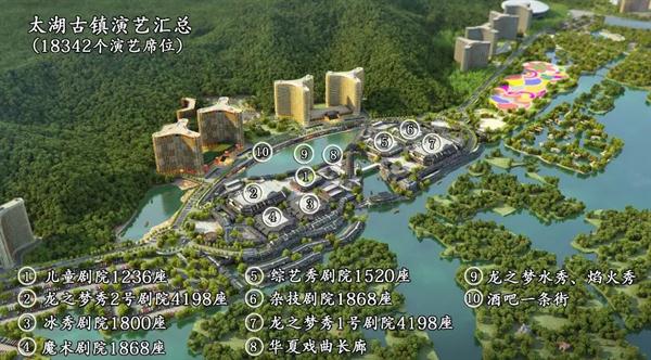 太湖龙之梦乐园已成功入选浙江省第三批特色小镇—太湖演艺小镇,作为全省"十三五"重大建设项目,自2016年4月8日开工建设进展迅速。这个集星级酒店群、养老公寓、太湖古镇、国际马戏城、动物世界、海洋世界、欢乐世界、嬉水世界、购物中心、快乐农场、盆景园、湿地公园、太湖药师文化园、婚纱摄影基地、大型酒吧街于一体的大型文化旅游项目,是全世界酒店客房、演艺席位、会议宴会设施最集中的区域,预计2018年下半年将陆续面市,目标打造成年接待游客3000万的旅游目的地。在文化演艺内容方面,整个项目合计拥有45个演艺场馆,其中文化演艺片区中的太湖古镇,拥有10座大型剧院。整个乐园内拥有75000个演艺席位,专职演员将达到2000名, 其中包括400名外籍演员。乐园将利用丰富的文化演出项目,讲好浙江故事、中国故事,弘扬中华传统文化,繁荣民族文艺舞台,促进中外文化交流。