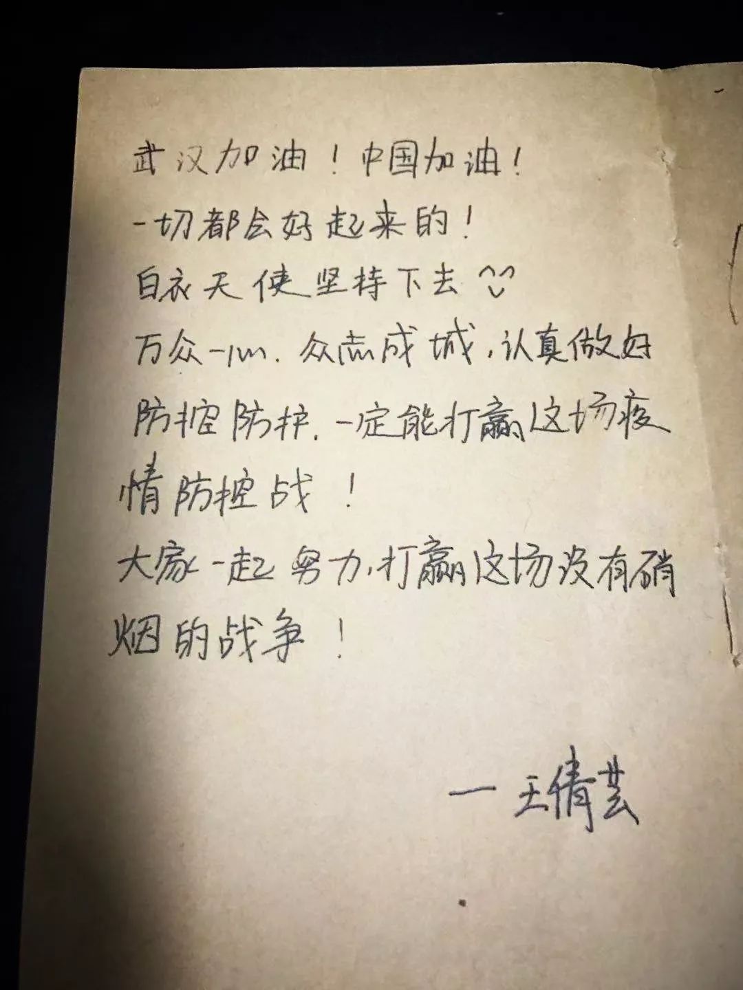 我们都有一个共同的名字叫中国,全国人民永远与你们同在,武汉经历过洪水,经历过暴雪,都扛了过来,这次也一定会赢!加油,白衣天使们!加油,武汉!