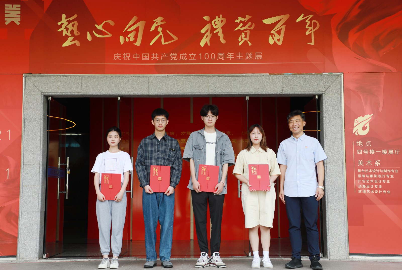本次展览由美术系承办,是学校庆祝中国共产党百年华诞主要活动之一。整个展览分为“开天辟地”“改天换地”“翻天覆地”“惊天动地”四大篇章,涵盖了美术系舞台艺术设计与制作专业、服装与服饰设计专业、广告艺术设计专业、动漫设计专业及环境艺术设计专业等五个展示板块的美术作品。舞台艺术设计与制作专业展示板块以绘景的形式生动地展现了“中共一大会址”、“嘉兴南湖红船”和“革命圣地延安宝塔山”三个重要的历史地点与场景;服装与服饰设计专业展示板块结合专业教学开展《清溪谣》《黎明前的诀别》等剧目的服装服饰设计,以舞台服装实物进行呈现;广告艺术设计专业展示板块主要展出反映新时代新风貌的主题海报;动漫设计专业展示板块运用插画栩栩如生地再现了改革开放时期20位改革先锋人物;环境艺术设计专业展示板块通过资料查找和模型搭建等程序,等比例缩放手工制作了天安门及人民大会堂的实物模型。