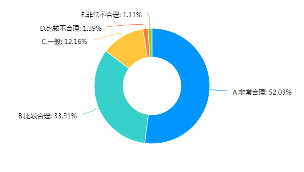 专业课程开设的合理性。52.03%的学生认为很合理,33.31%的学生认为比较合理,认为一般、不太合理或很不合理的学生分别占12.16%、1.39%、1.11%。