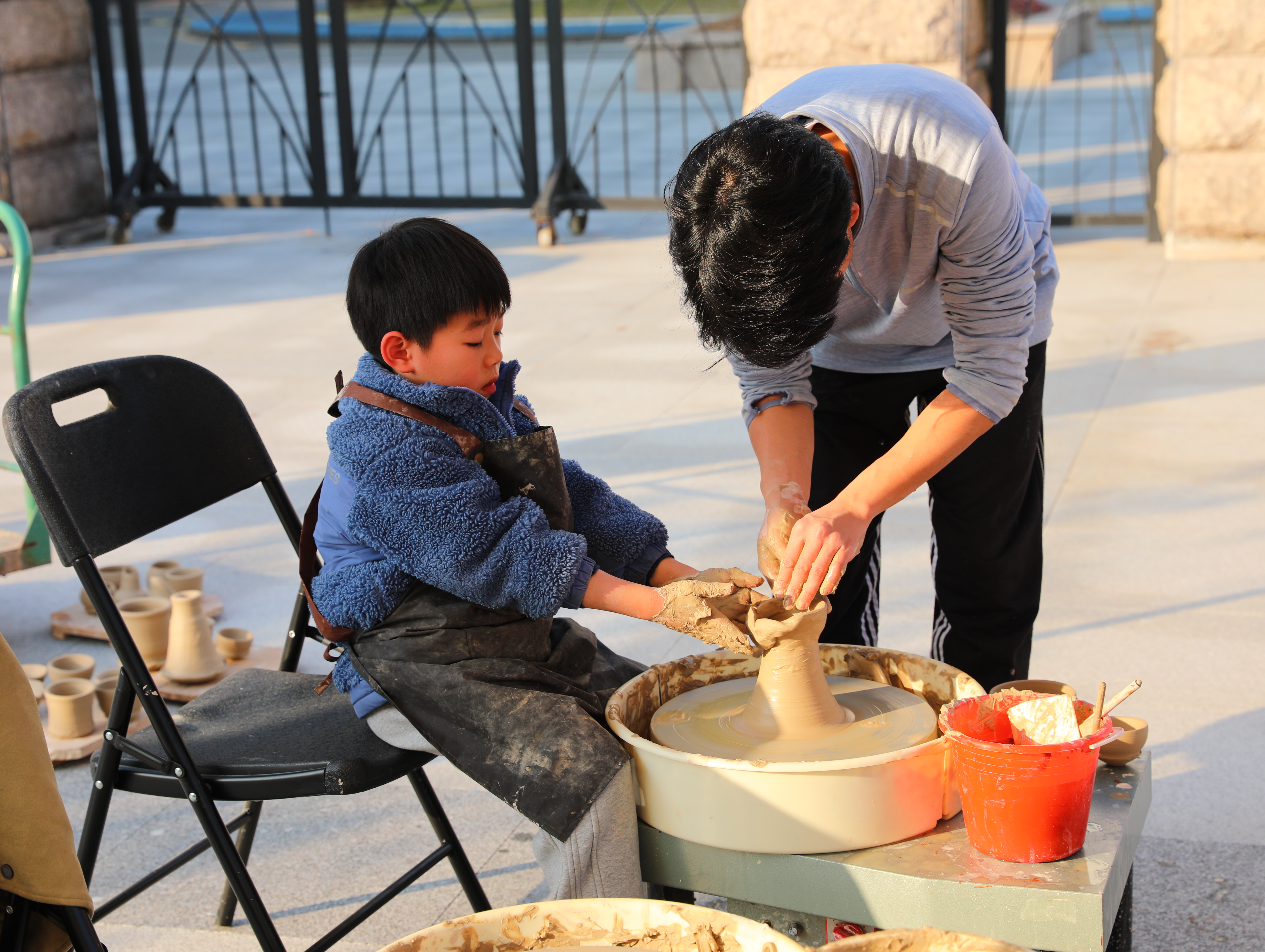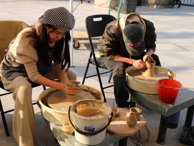 非遗活态展示区与生活美学浙艺课体验区人头攒动,人们在水印木刻悠长的脉络与繁复的技艺中思考,在扇面上体悟生活中的艺术,在陶艺中传承历经千年的手艺巧思。同学们纷纷上前体验非遗技艺,感受传统手工艺的独特魅力。