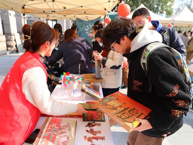 活动现场特邀自然造物、田博匠新、文博公司等非遗企业参与,摊位上非遗手工艺品琳琅满目,引得不少老师、同学驻足观赏。